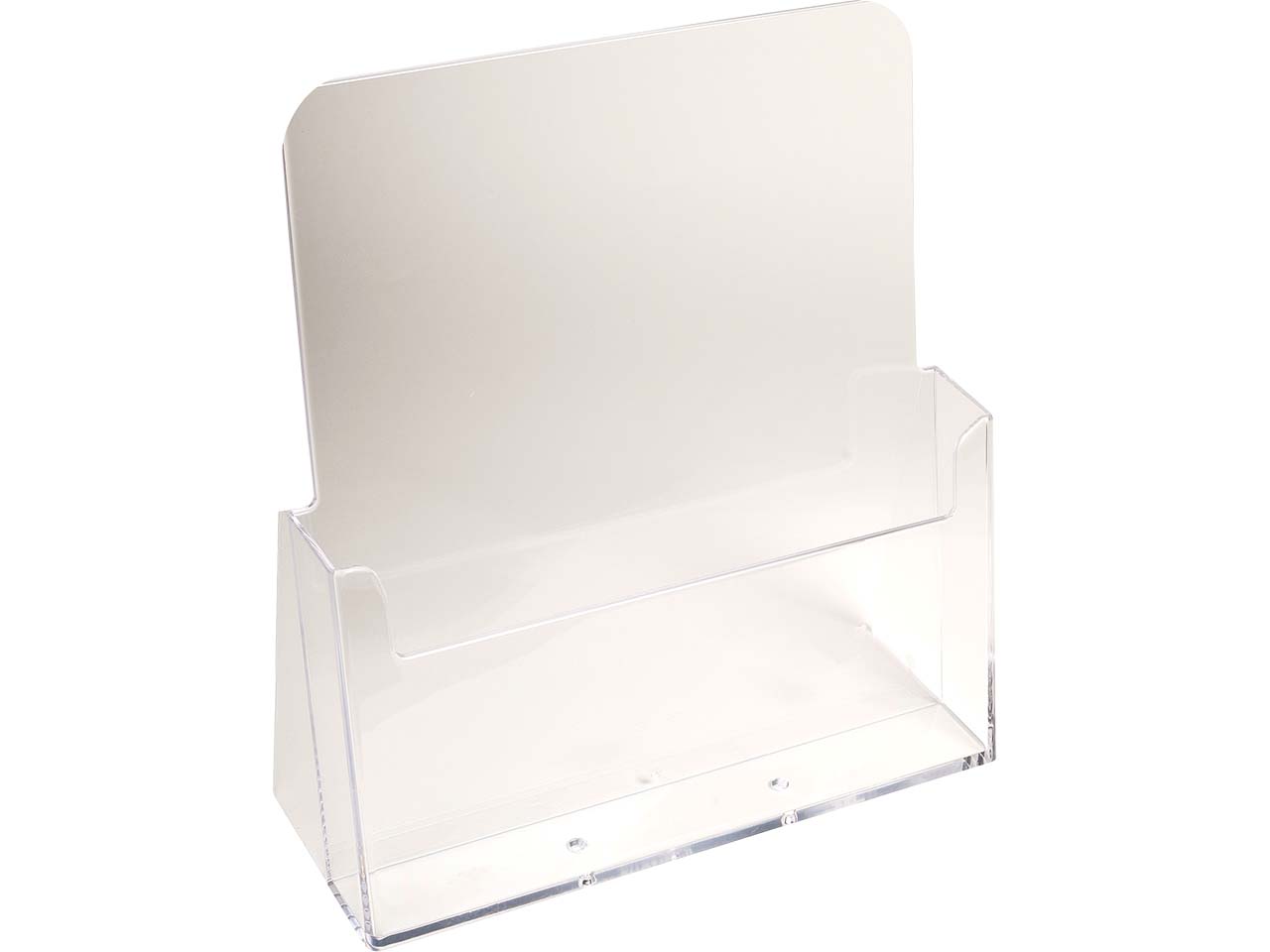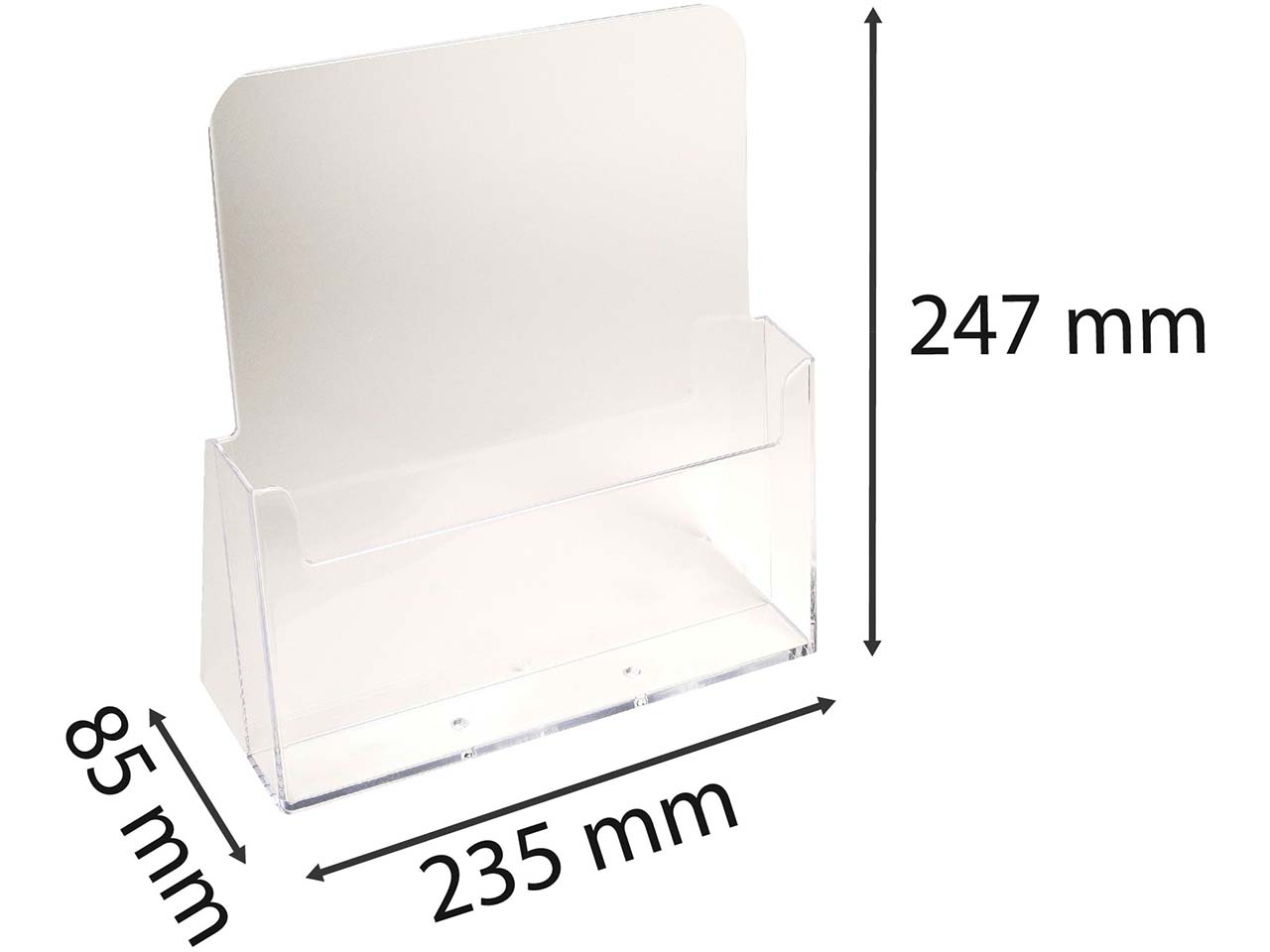 Der Tischprospekthalter ermöglicht es, Werbe- und Informationsmaterialien wie Flyer oder Prospekte zur Selbstbedienung aufzustellen. Der transparente Halter im Format DIN A4 ist in einem Stück aus hochwertigem, robustem Kunststoff gefertigt und lenkt den Blick auf das Wesentliche. Das Fach hat eine Fülltiefe von 28 mm.