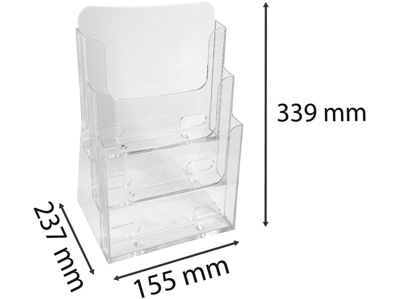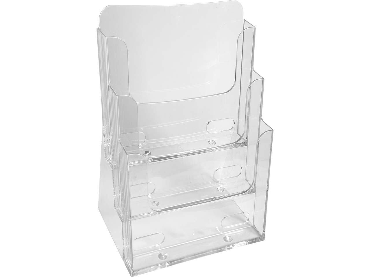 Werbe- und Informationsmaterial zum Mitnehmen! Mit diesem Tischprospekthalter im Format DIN A4 ist es ganz einfach, Flyer, Prospekte und Co. zur Selbstbedienung aufzustellen. Der transparente Halter ist in einem Stück aus hochwertigem, robustem Kunststoff hergestellt. Die drei Fächer lenken den Blick auf das Wesentliche. Jedes Fach hat eine Fülltiefe von 28 mm. Ideal für die Aufstellung am Empfang, im Büro und mehr.