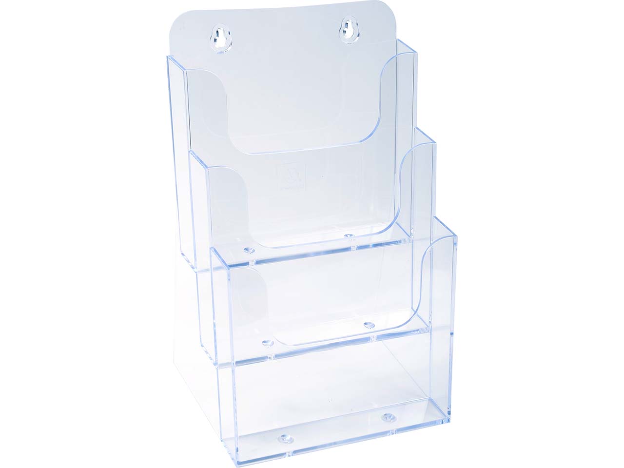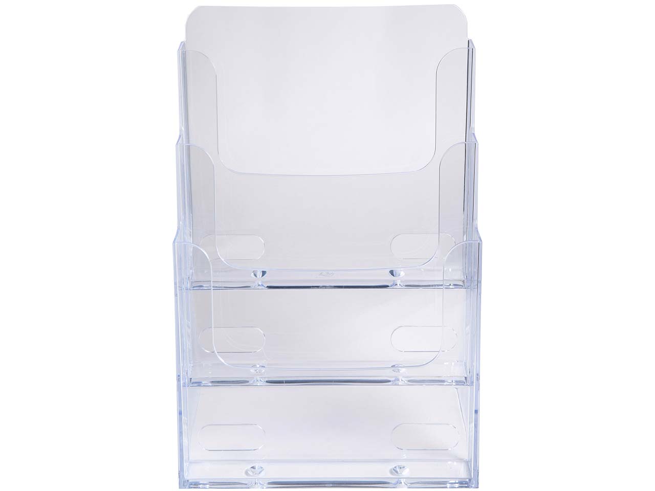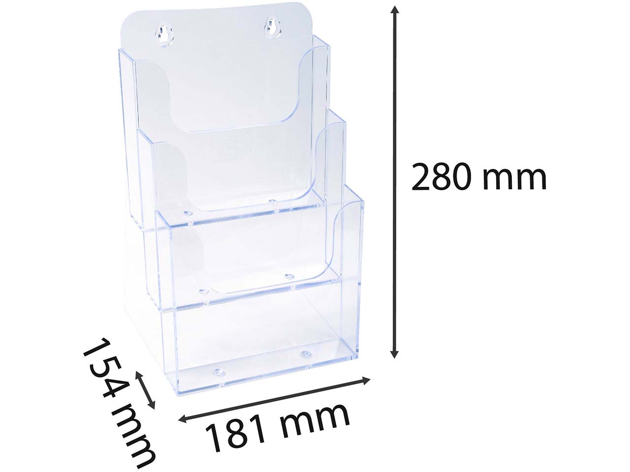 Werbe- und Informationsmaterial zum Mitnehmen! Mit diesem Tischprospekthalter im Format DIN A5 ist es ganz einfach, Flyer, Prospekte und Co. zur Selbstbedienung aufzustellen. Der transparente Halter ist in einem Stück aus hochwertigem, robustem Kunststoff hergestellt. Die drei Fächer lenken den Blick auf das Wesentliche. Jedes Fach hat eine Fülltiefe von 28 mm. Ideal für die Aufstellung am Empfang, im Büro und mehr.
