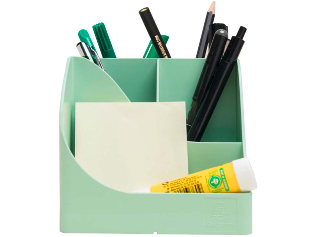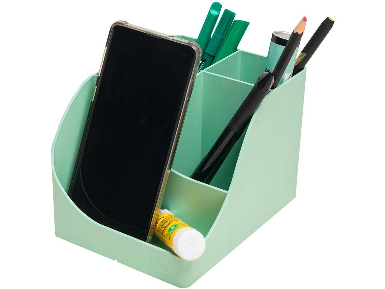 Dieser Stifteköcher muss auf jeden Schreibtisch! Er bietet mit fünf Fächern viel Platz für die wichtigsten Utensilien. Die hohen Fächer eignen sich für Schere, Stifte, Lineal und Co. Das flache Fach ist ideal für Büroklammern, Reißzwecken oder USB-Sticks. Es kann auch als Ablage für das Smartphone benutzt werden. Der Köcher besteht aus recyceltem Kunststoff und ist mit dem Blauen Engel ausgezeichnet.