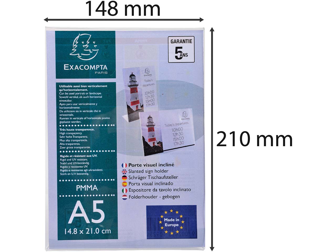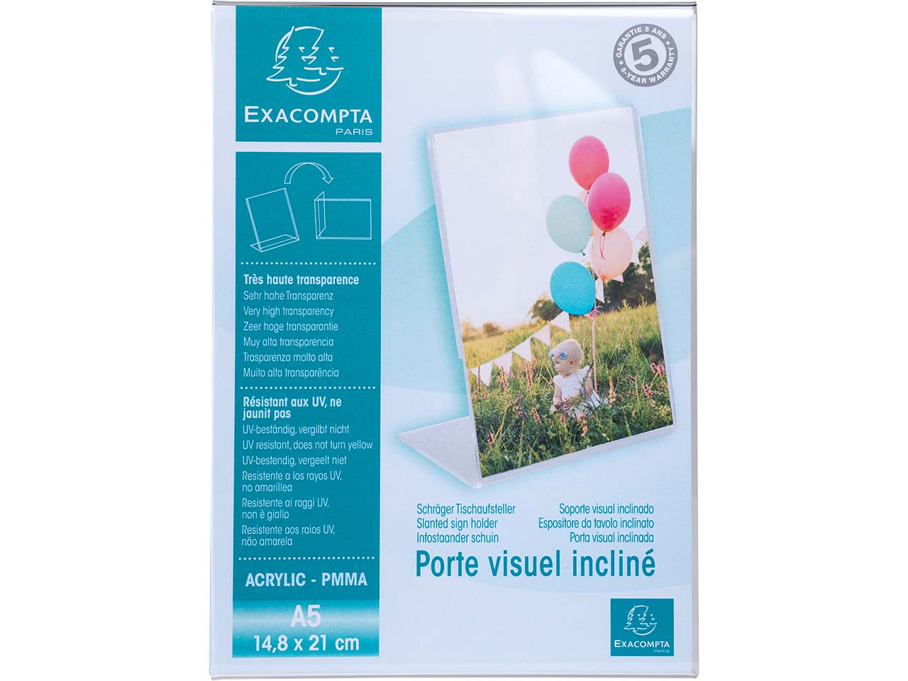 Dem Schreibtisch eine individuelle Note verleihen oder das Lieblingsfoto ins Regal stellen: Der Tischaufsteller ist in beiden Fällen die perfekte Wahl! Der Aufsteller aus hochwertigem Acryl hat eine sehr hohe Transparenz, sodass der Inhalt optimal hervorgehoben wird. Das Material ist UV-beständig und vergilbt nicht. Die vertikale Neigung sorgt ebenfalls für eine optimale Sichtbarkeit von Fotos oder Dokumenten. Dank des abgeschrägten Fundaments ist es möglich, den Tischaufsteller vertikal oder horizontal zu nutzen.