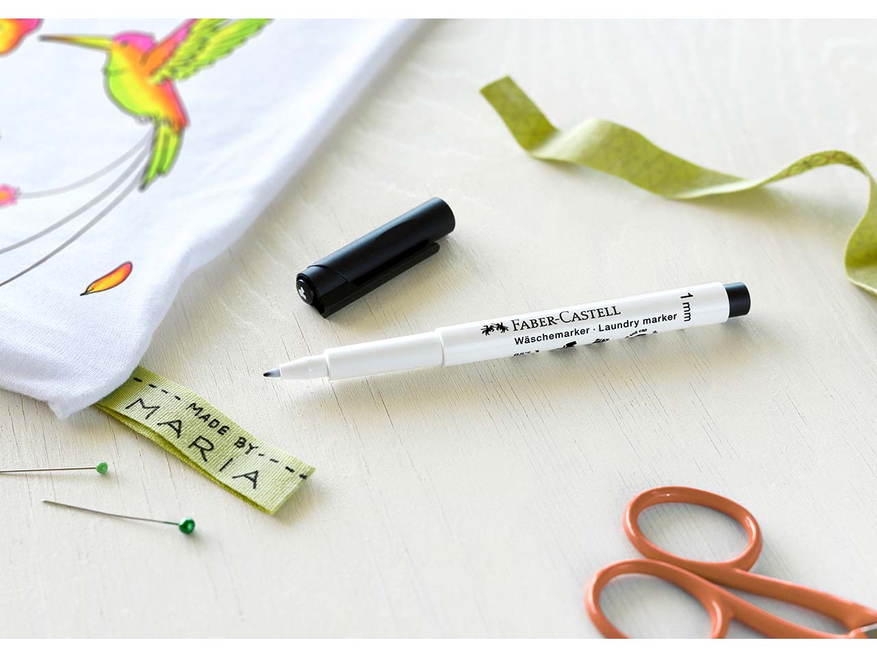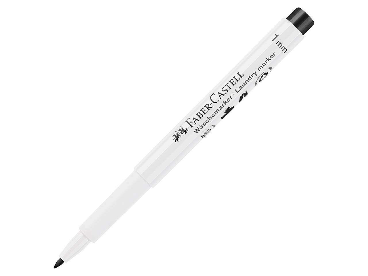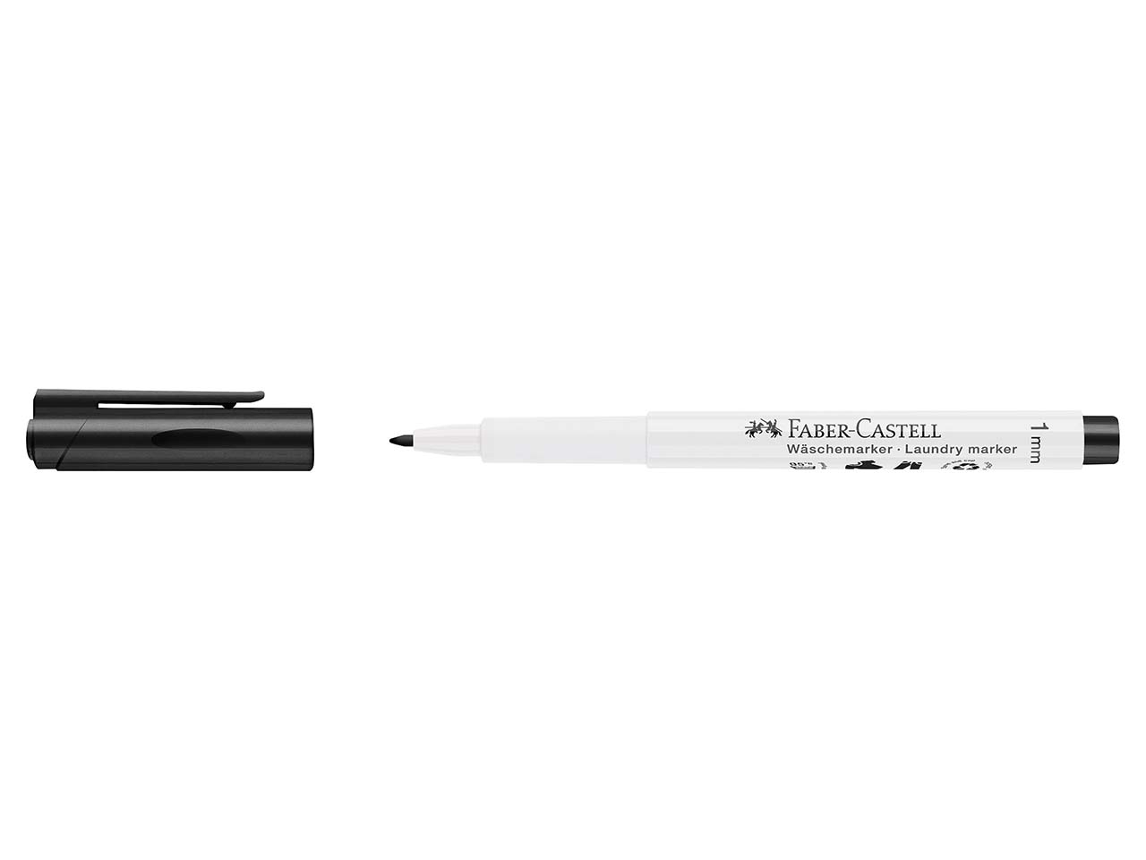 Hinterlässt einen bleibenden Eindruck: Der Permanentmarker von Faber-Castell ist ideal geeignet, um an Schuhe, Kleidung, etc. Namen, Abteilung oder Ähnliches anzubringen. Es passiert schnell, dass im Kindergarten, in der Schule oder im Verein ein falsches Kleidungsstück mitgenommen wird, weil es genauso aussieht wie das eigene. Hier schafft der Wäschemarker Abhilfe. Einfach Namen oder anderes Erkennungszeichen damit markieren und schon ist das Problem gelöst. Tipp: Da der Marker je nach Stoffart bis 95 °C nicht auswaschbar ist, eignet er sich auch ideal für Autogramme auf Trikots oder Caps! Selbst Polyesterstoffe markiert der Stift. Zum Fixieren der Schrift einfach 24 Stunden warten oder ohne Dampffunktion bügeln.