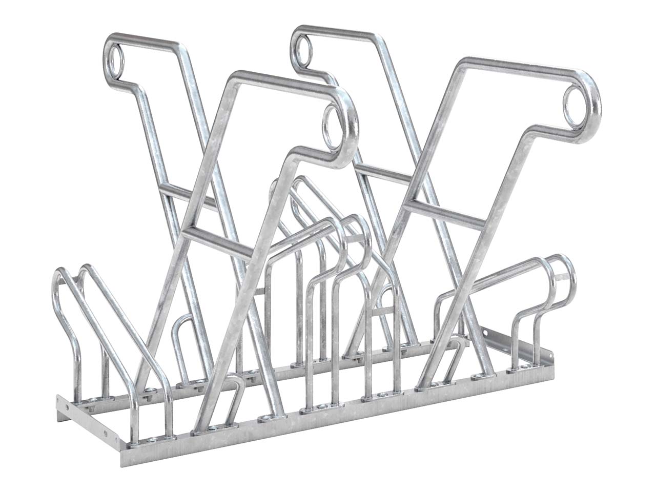 Der beidseitige "Anlehnparker 2600 XBF" mit besonders breitem Anlehnbügel schafft mit abwechselnder Hoch-/Tiefeinstellung eine platzsparende Parkmöglichkeit. Die Höhendifferenz von 200 mm vereinfacht die Handhabung mit extrabreiten Lenkern. Der komfortable Radabstand von 540 verhindert Beeinträchtigung anderer Räder beim Ein-/Ausparken. Der moderne Fahrradständer ist zur Reihenverbindung und Bodenbefestigung vorbereitet und erweiterbar. Für 4, 8 oder 12 Einstellplätze.