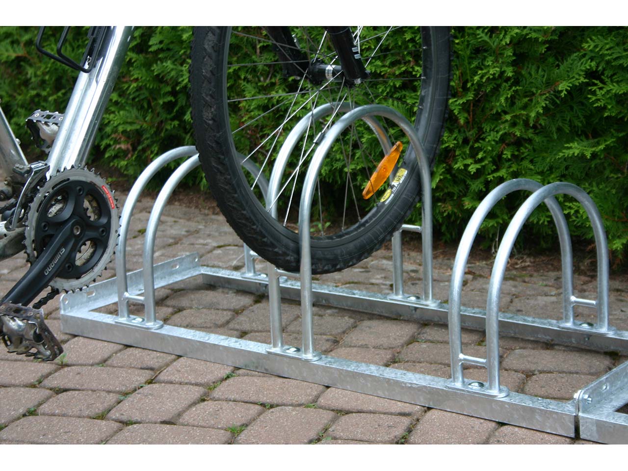 Der schwungvoll geformte, einseitige Fahrradständer "Bogenparker 5000" mit bogenförmigen Bügeln aus korrosionsgeschützt verzinktem Rundrohr ermöglicht mit abwechselnder Tief- und Hocheinstellung eine platzsparende Parkmöglichkeit. Der Fahrradständer mit 2, 3, 4, 5 oder 6 Einstellplätzen und 350 mm Radabstand ist zur Reihenverbindung und Bodenbefestigung vorbereitet. Die Stellraumtiefe beträgt ca. 1.850 mm. Eignet sich auch für Mountainbikes.
