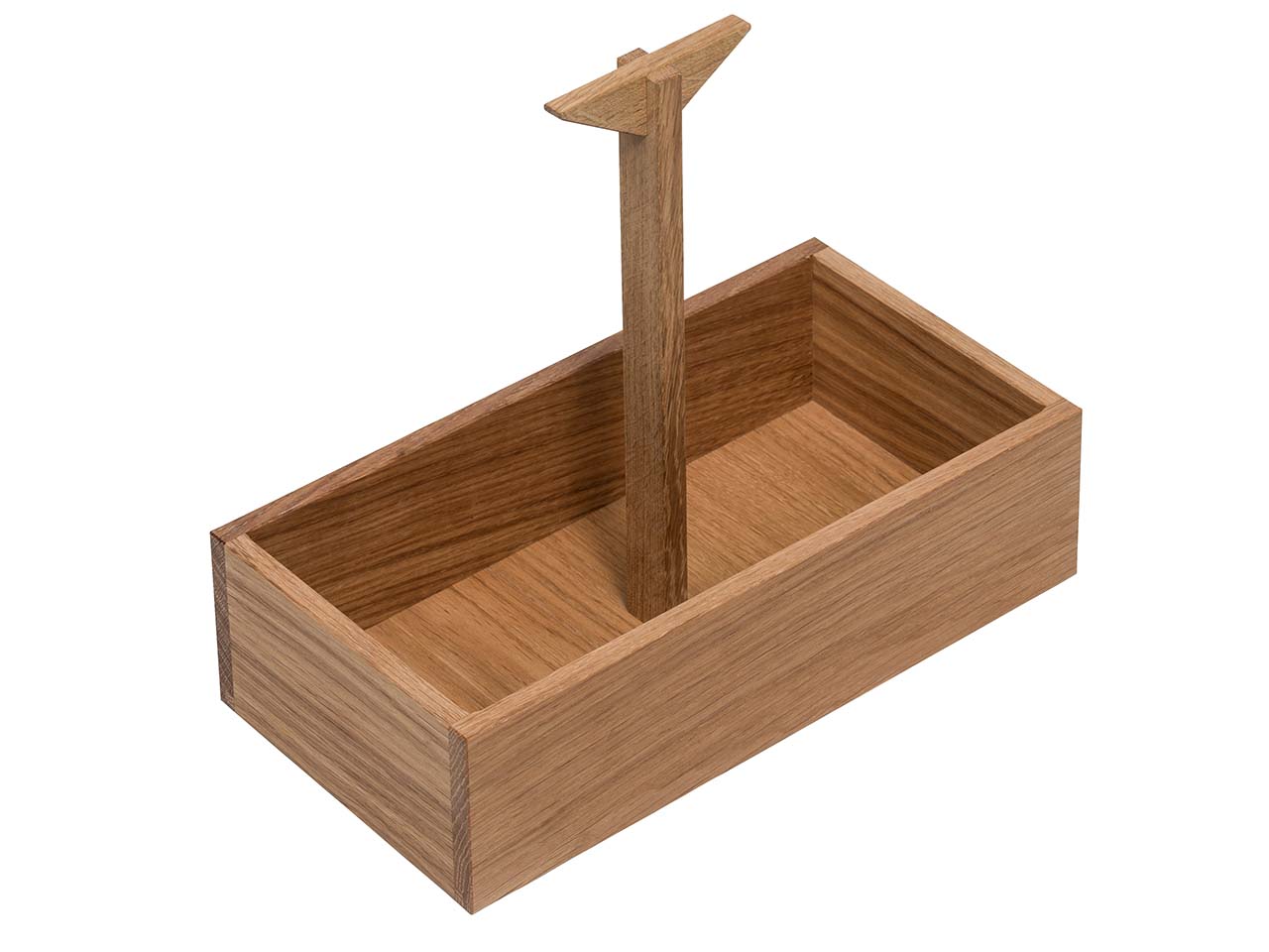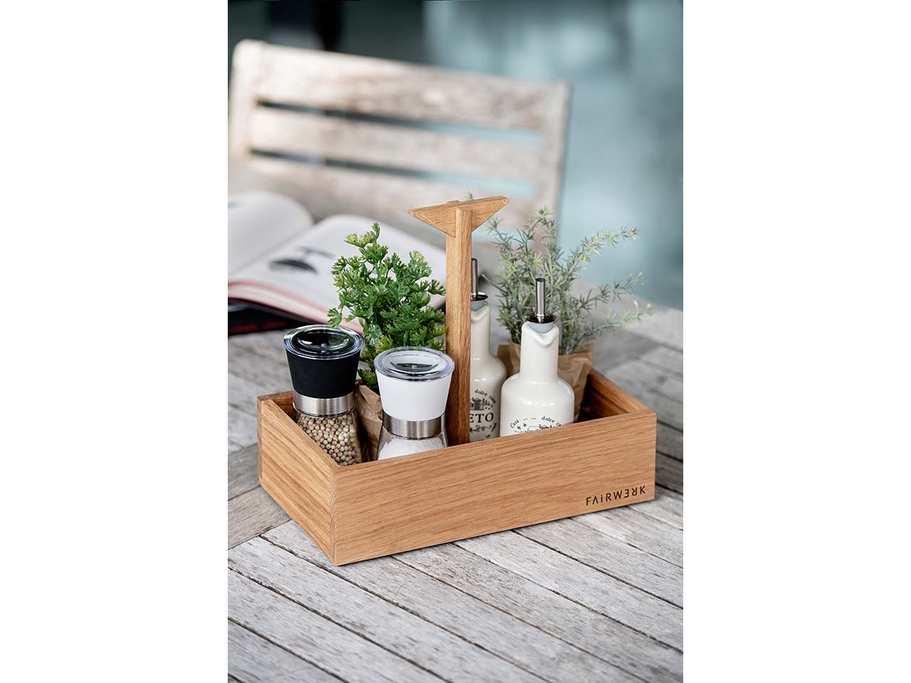 Manche Dinge wie Gewürze, Salz, Pfeffer und Co. werden tagtäglich in der Küche gebraucht und sollen weder in der Schublade verschwinden noch die Arbeitsplatte blockieren – genau hier kann die Gewürzkiste ihr Potential ausspielen! Essig, Öl und Co. sind in der Kiste aus geöltem Eichenholz ordentlich und stilsicher aufbewahrt. Muss unter der Kiste saubergemacht werden, hebt man sie einfach am Griff hoch. Das gleiche gilt auch, wenn Salz und Pfeffer mit auf den Tisch sollen. In der Gewürzkiste sind sie mit einem Griff dabei! Der pflanzliche Filz auf der Unterseite der Box sorgt für beste Standfestigkeit. In zwei verschiedenen Größen erhältlich.