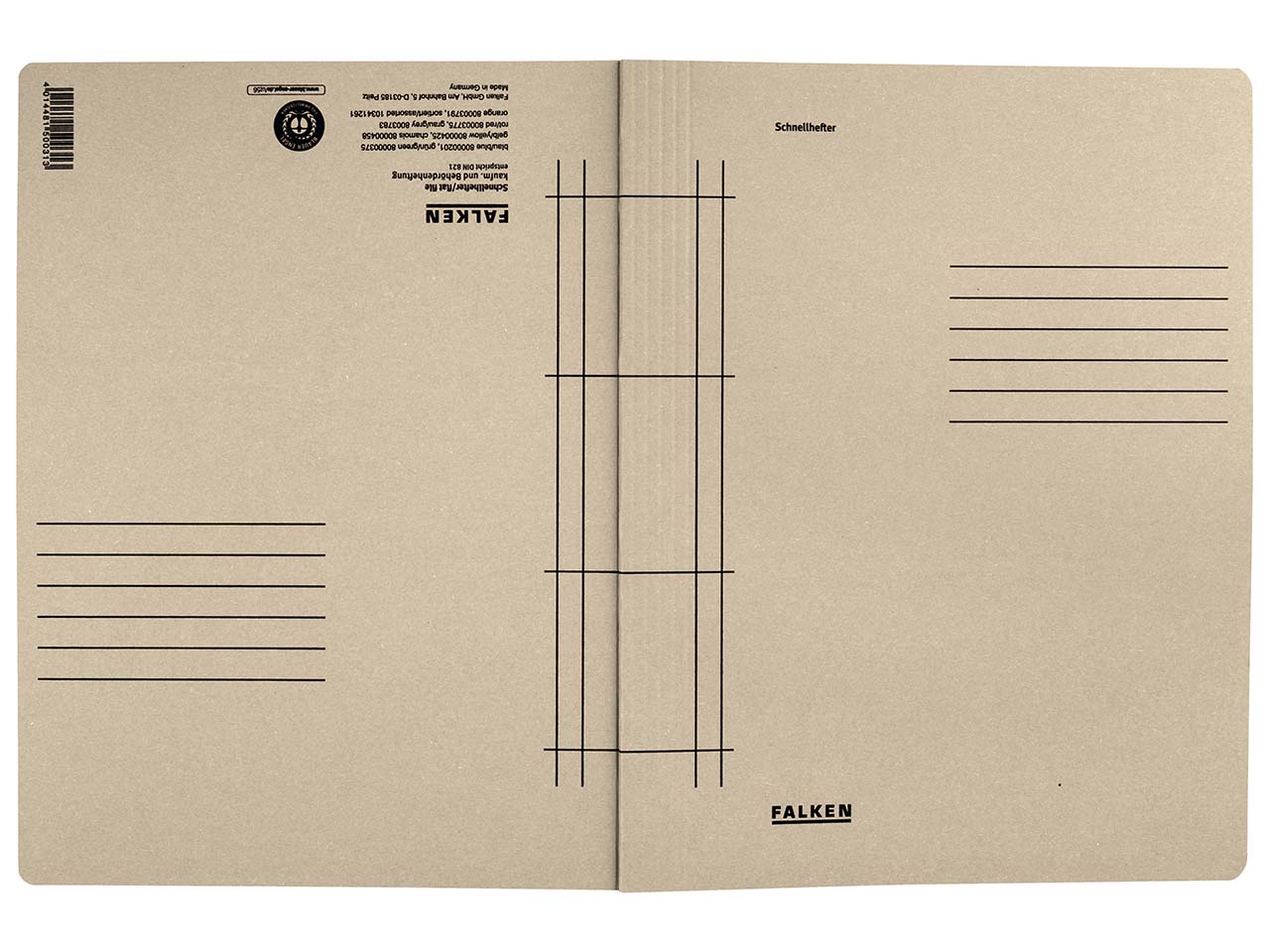Mit dem klassischen Falken Schnellhefter aus Manila-Recyclingkarton heften Sie gelochtes Schriftgut ordentlich ab. Der stabile Hefter in 250 g/m²-Qualität verfügt über eine Heftzunge, Abdeckleiste aus Metall sowie Liniendruck auf dem Vorder- und Rückendeckel. Die Füllhöhe von ca. 2 cm bietet Platz für bis zu 200 Blatt (80 g/m²). Im Format DIN A4.