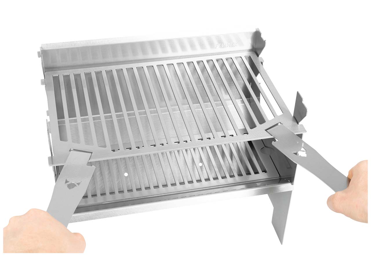 Der perfekt durchdesignte Fennek Outdoor Grill "2.0" stellt eine optimale Alternative zu Einweggrills dar und bietet noch mehr Grillfläche als der kleine Fennek. Er begleitet Sie zum Camping, zum Trekking oder einfach auf den Balkon. Durch die kompakte Bauweise ist der vollwertige Holzkohlegrill für den mobilen Einsatz geeignet. Der Grill ist nur geringfügig größer als ein Tablet oder ein kleiner Laptop. Der Grill ist spülmaschinengeeignet. Lieferung inkl. 1 Rückwand, 2 Seitenwände, 2 Kohlebleche, 1 Kohlerost, 1 Grillrost, 2 Griffe (entspricht montiert 1 Grillzange), Aufbauanleitung. B 39,3 x T 25,6 x H 31,3 cm.