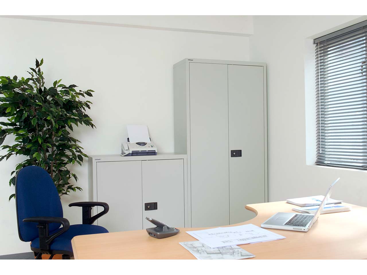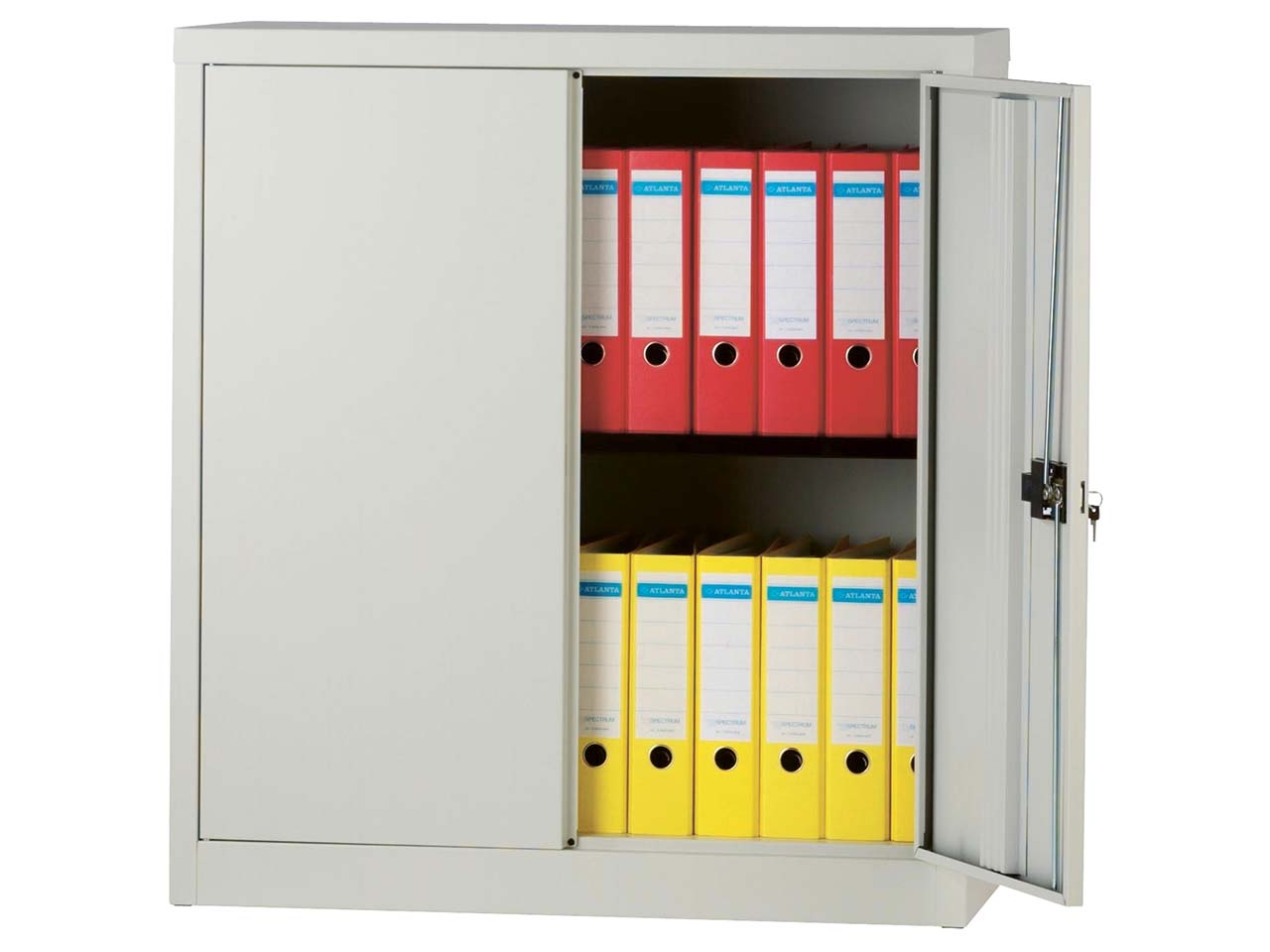 Der BISLEY Flügeltürenschrank "Light" ist zu 100 % aus Stahl gefertigt. Mit geschweißtem, sehr robustem Korpus, Klappgriff mit Schloss und 1 Fachboden für 2 Ordnerhöhen. B 91,4 x T 40 x H 100 cm.