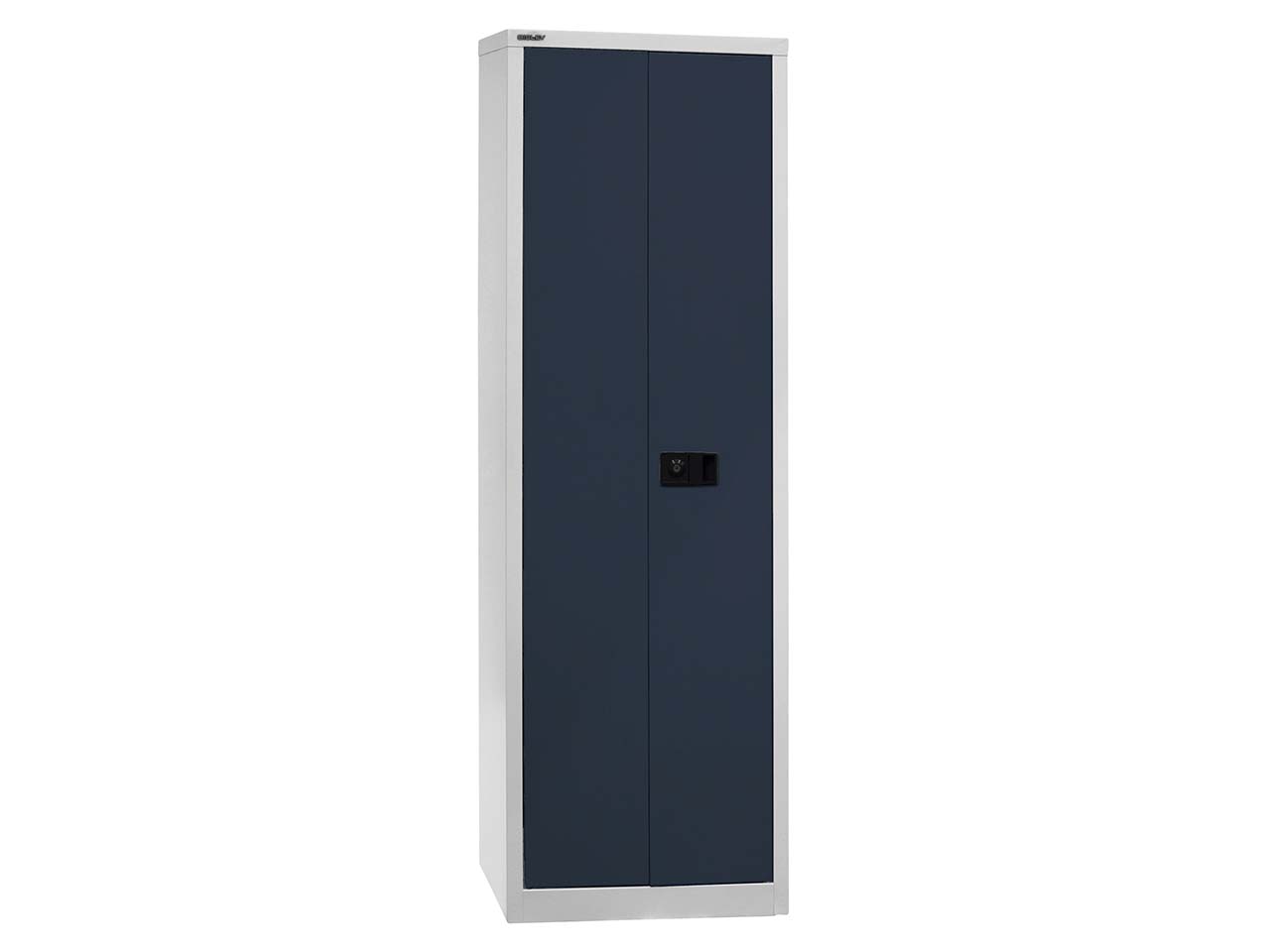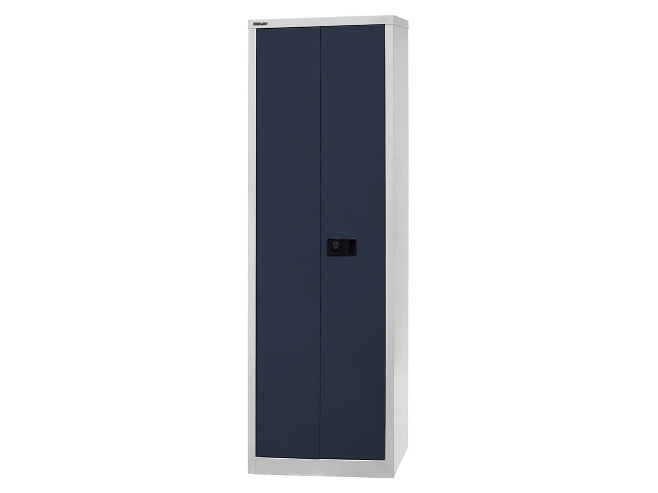 Der BISLEY Flügeltürenschrank "Light" ist zu 100 % aus Stahl gefertigt. Mit geschweißtem, sehr robustem Korpus, Klappgriff mit Schloss und 4 lackierten Fachböden für 5 Ordnerhöhen. B 60 x T 40 x H 195 cm.