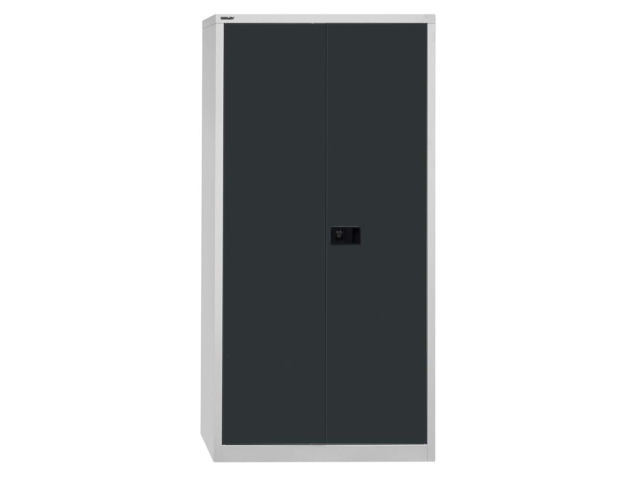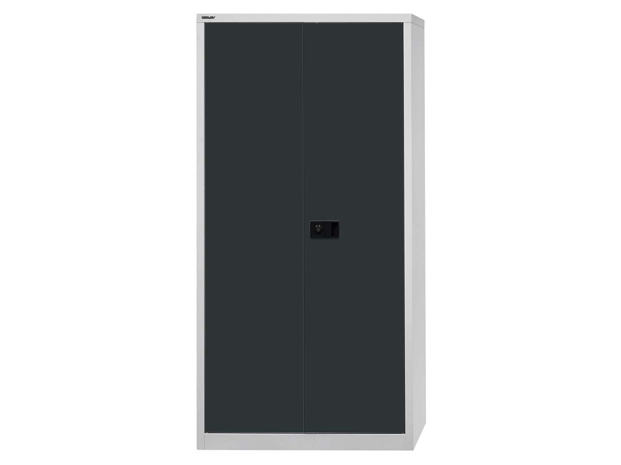 Der BISLEY Flügeltürenschrank "Light" ist zu 100 % aus Stahl gefertigt. Mit geschweißtem, sehr robustem Korpus, Klappgriff mit Schloss und 4 lackierten Fachböden für 5 Ordnerhöhen. B 91,4 x T 40 x H 195 cm.