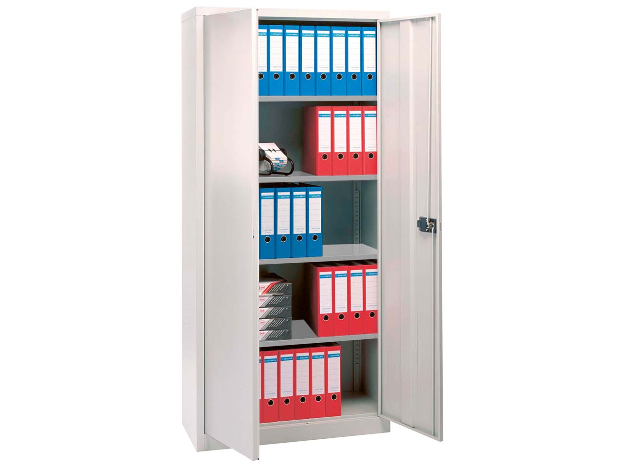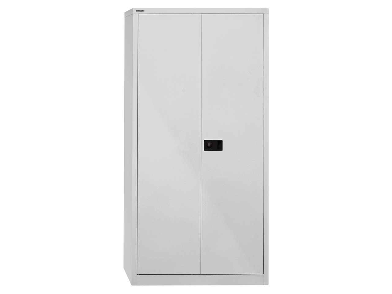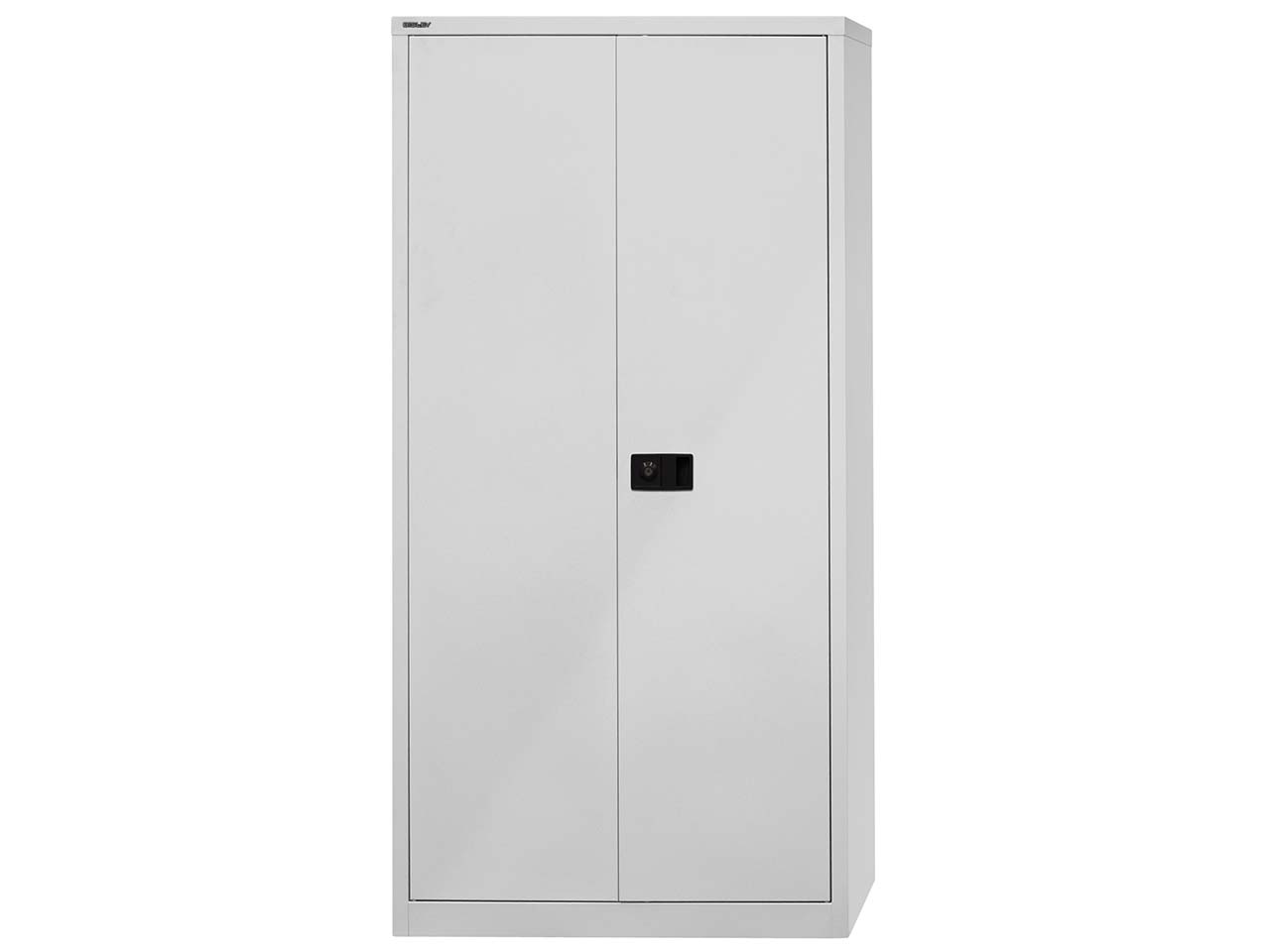 Der BISLEY Flügeltürenschrank "Light" ist zu 100 % aus Stahl gefertigt. Mit geschweißtem, sehr robustem Korpus, Klappgriff mit Schloss und 4 lackierten Fachböden für 5 Ordnerhöhen. B 91,4 x T 40 x H 195 cm.