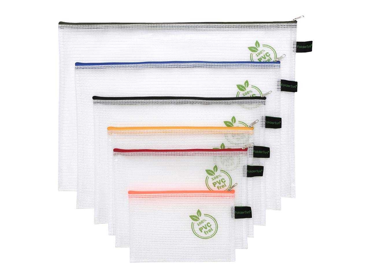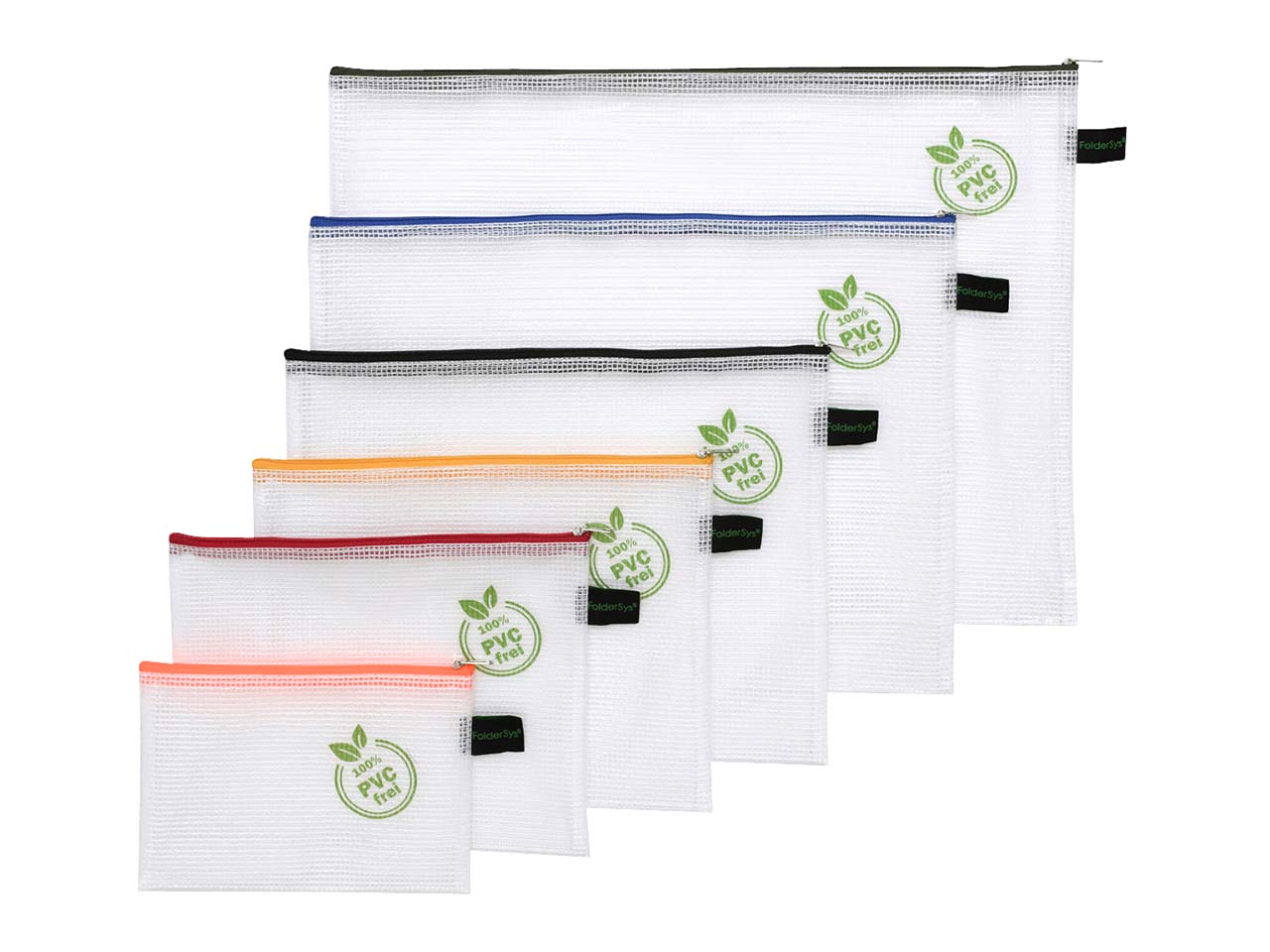 Die PVC-freien FolderSys Reißverschlussbeutel "Phat-Bag" in 6 verschiedenen Größen sind aus chlor- und weichmacherfreiem Kunststoff gefertigt. Der Textil-Reißverschluss verfügt über einen Metallgleiter. Die edlen Beutel mit Bordierband und widerstandsfähiger, geschmeidiger Folie eignen sich optimal zur Aufbewahrung und zum Sammeln von Kleinteilen. Set mit 1 x A4, 1 x A5, 1 x A6, 1 x B4, 1 x B5, 1 x B6, sortierte Farben.