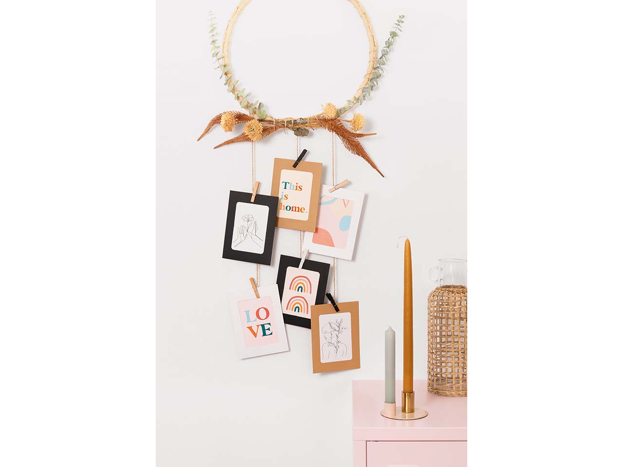 - Mit Bilderrahmen, Holzklammern und Juteschnur