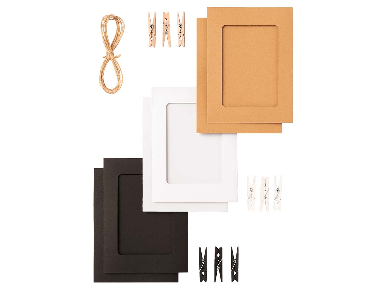 | Inhalt: | 9 Bilderrahmen (3x3) in den Farben weiß, schwarz und natur (10x15 cm für DIN A6 Bilder), inkl. je 3 weißen, schwarzen und naturfarbenen Holzklammern, Juteschnur 1,8 m |