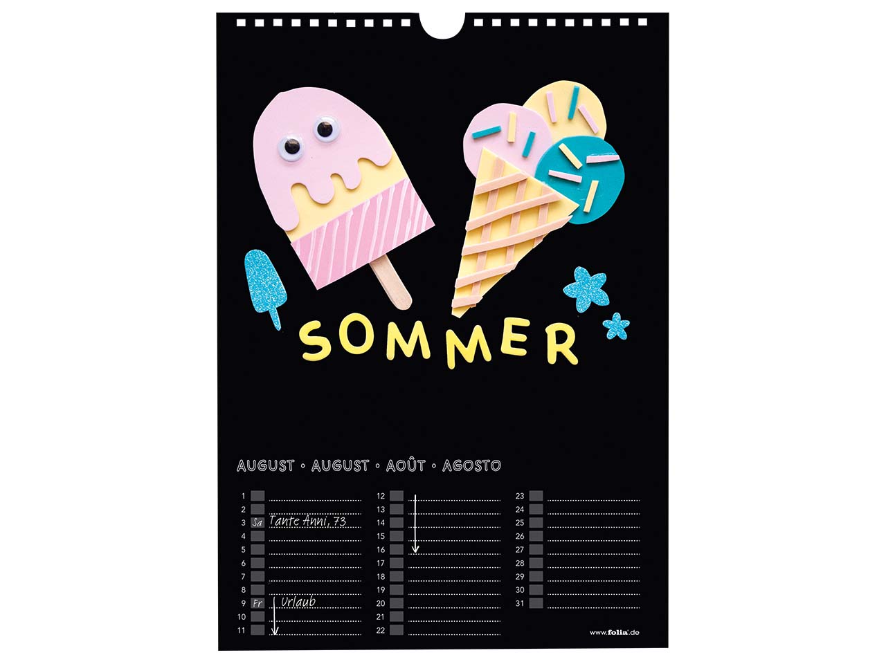 Der spiralgebundene Dauerkalender eignet sich hervorragend für kreative Köpfe! Der Kalender besteht aus schwarzem Papier, das nach Belieben bemalt, beklebt und dekoriert werden kann. Auf diese Weise entsteht ein einzigartiger Kalender, den man entweder für sich selbst verwenden oder als Geschenk weitergeben kann. Mit einer Grammatur von 170 g/m² bietet der jahresunabhängige Kalender eine erstklassige und stabile Qualität. Der Bastel-Dauerkalender in PEFC-zertifizierter Ausführung ist mehrsprachig und hat DIN-A4-Format.