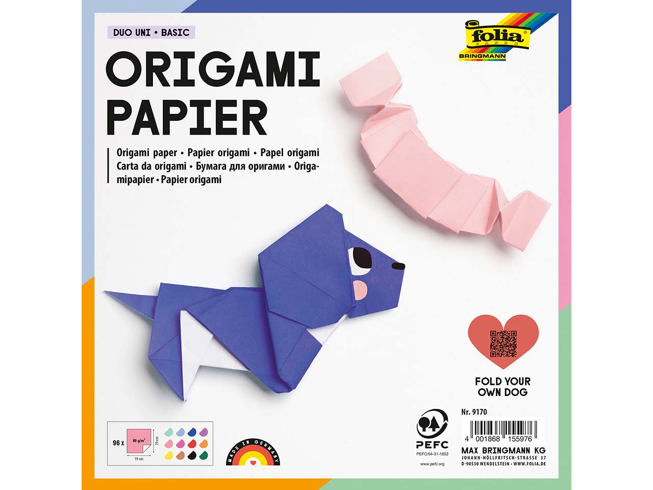 Origami-Falttechnik übt eine ganz spezielle Faszination aus! Um die Figuren und Formen selber zu machen, sind diese Faltblätter von folia ideal geeignet. Das Origamipapier in PEFC-zertifizierter Qualität hat eine Grammatur von 80 g/m² und ist damit stabil genug für verschiedene Bastelarbeiten. Die Origami-Faltblätter sind ein kreativer Spaß für Groß und Klein.