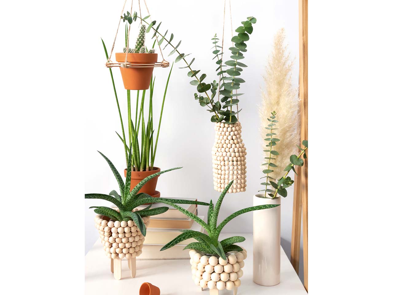 - Mit Holzperlen, Holzklammern, Holzstäbchen, etc.