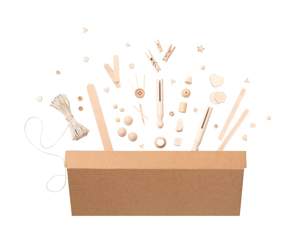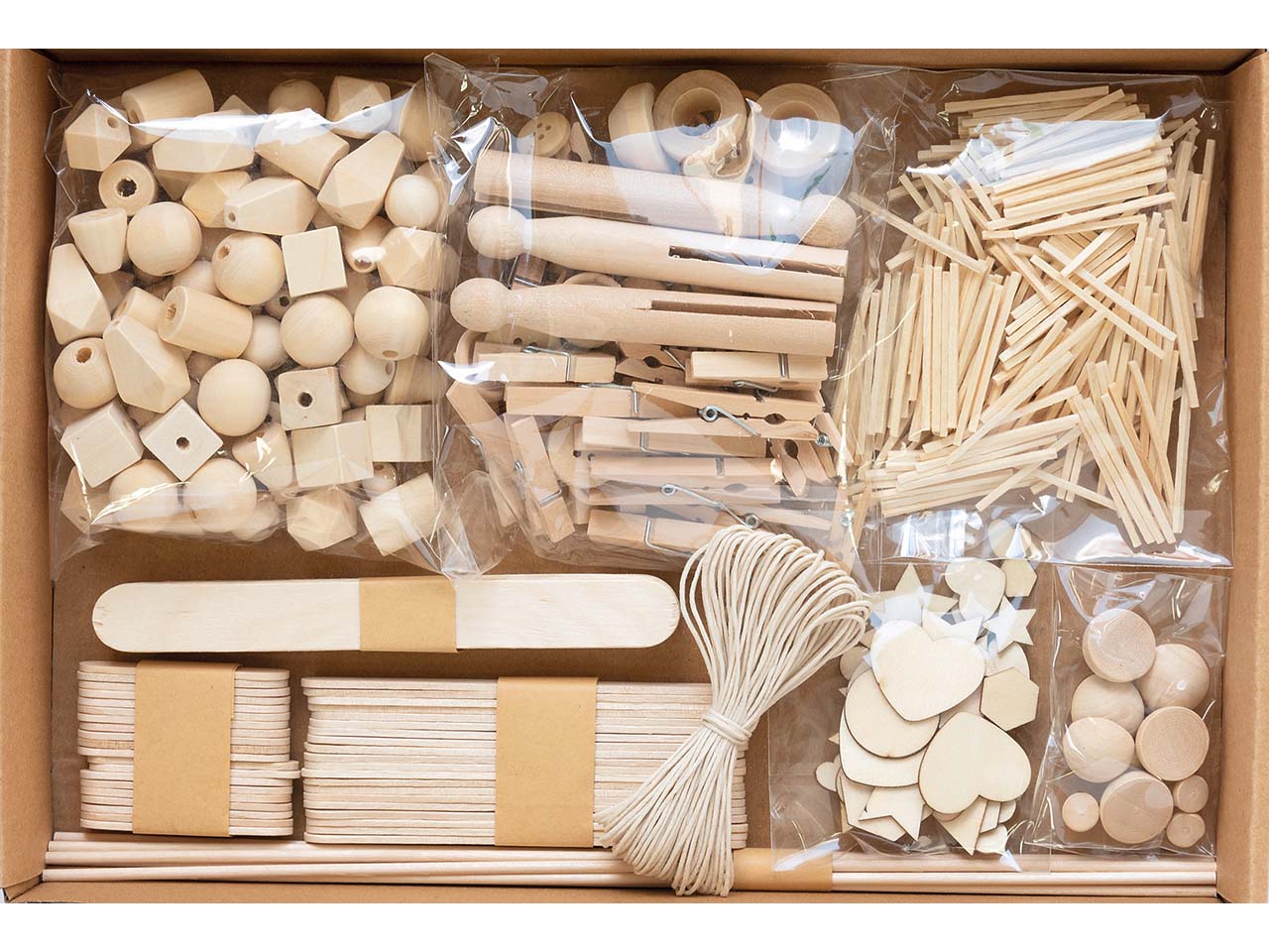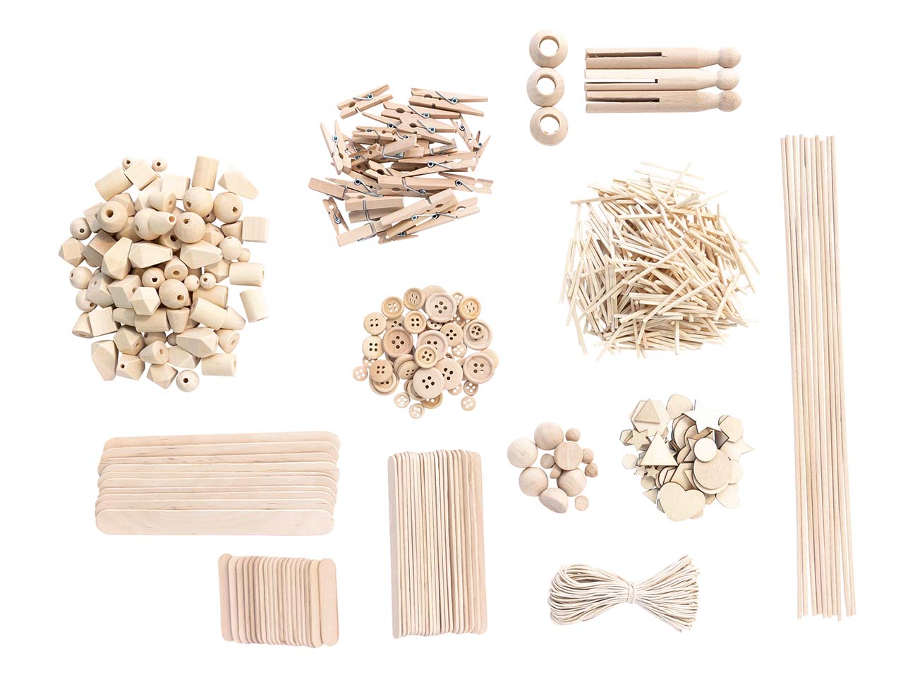 | Inhalt: | 40 Holzperlen rund sortiert, 50 Holzperlen geometrisch sortiert, 12 Halbkugeln sortiert, 30 Holzklammern sortiert, 3 Wäscheklammern inklusive Halter, 300 Bastelhölzer sortiert, 10 Holzstäbchen rund 30cm, 50 Holzstäbchen flach sortiert, 50 Knöpfe, 50 Streuteile sortiert, 1 Band 10 Meter natur |