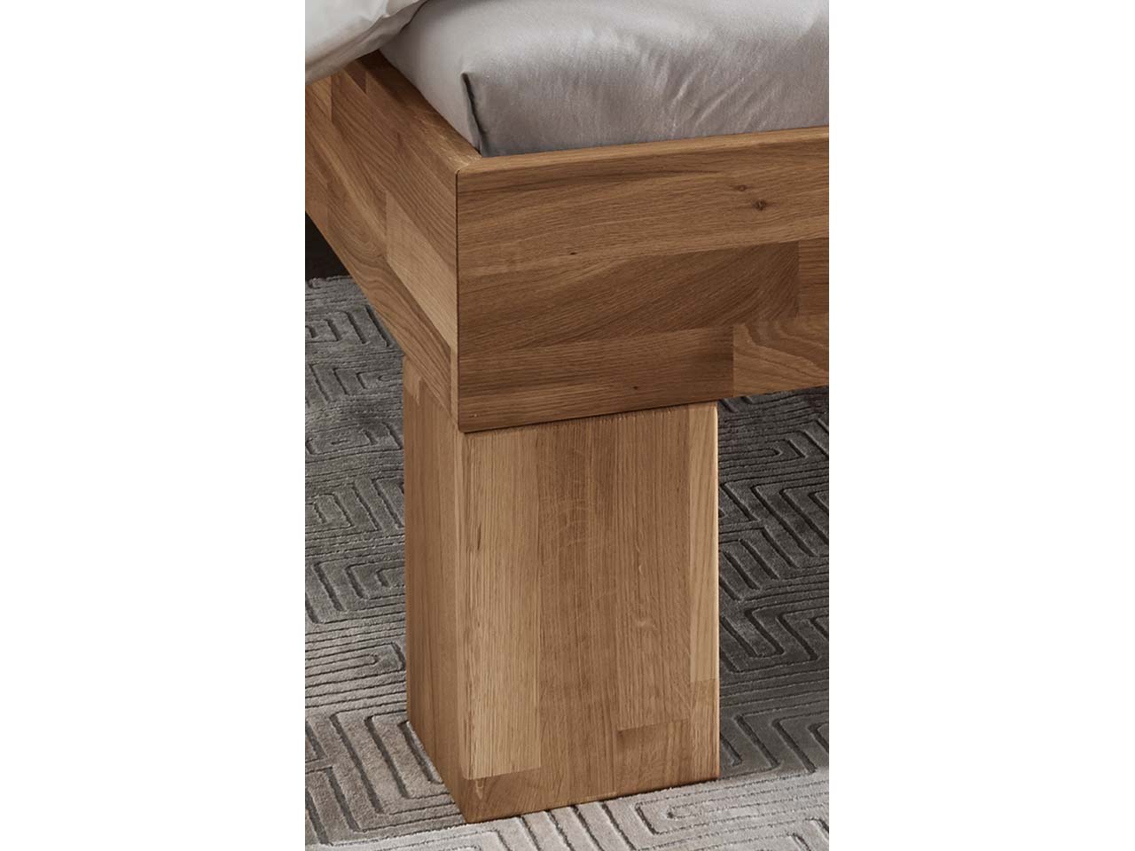 Mehr als nur ein Bett: Diese wunderschöne Konstruktion in klarer Formensprache ist ein Rückzugsort, an dem man es sich so richtig gemütlich machen kann. Das massive Eichenholz mit intensiver, ausdrucksstarker Maserung drückt Natürlichkeit und Ruhe aus. Durch die kräftigen, gewinkelten Standfüße entsteht viel Stabilität, die Sicherheit vermittelt. Das Bett ist handwerklich hochwertig parkettverleimt und ein langjähriger Begleiter. An dem Kopfteil lässt es sich angenehm sitzen und es ist möglich, das Bett auch sitzend zu genießen z.B. um zu lesen. Durch die Holzoberflächenbehandlung mit Öl auf Pflanzenbasis bleiben die Poren offen, wodurch ein angenehmes Raumklima entsteht. In verschiedenen Größen erhältlich.