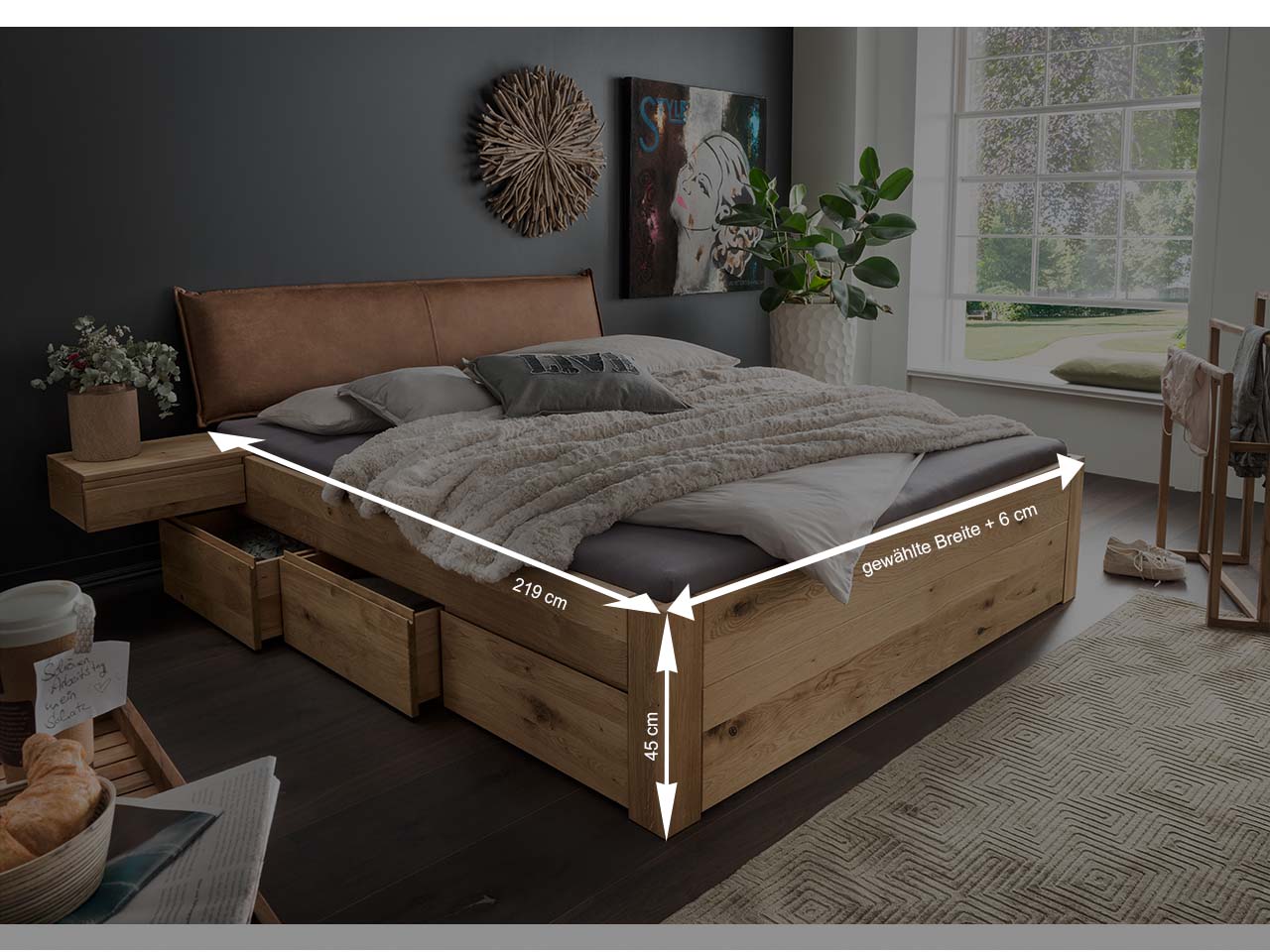 Optisch ein Traum: Dieses Massivholzbett bereichert jedes Schlafzimmer. Die klare Formensprache harmonisiert exzellent mit der Natürlichkeit des massiven Eichenholzes, das mit seiner ausdrucksstarken Maserung immer ein optisches Highlight ist. Dazu ist die Holzoberfläche mit Öl auf Pflanzenbasis behandelt, wodurch sie offenporig bleibt. Das Bettgestell steht auf eckigen Füßen, die bis zum Boden durchgehen. Zusätzlicher Stauraum für Bettzeug oder Kissen entsteht durch die Schubladen. Sie sorgen für mehr Aufgeräumtheit. Entspannen kann man hier nicht nur liegend, sondern auch sitzend: Das Kopfteil ist mit dem Stoffbezug ein Blickfänger, der dem Bett ein modernes Flair verleiht. Es ist sehr gemütlich und lädt zum Anlehnen ein. In verschiedenen Größen erhältlich.