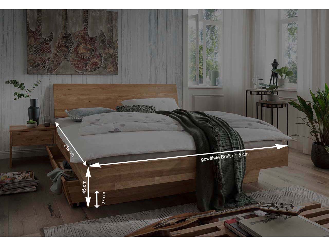 Forestales Schwebe-Massivholzbett "Astoria" mit Holzunterbau und 2 Schubladen, mit Kopfteil I