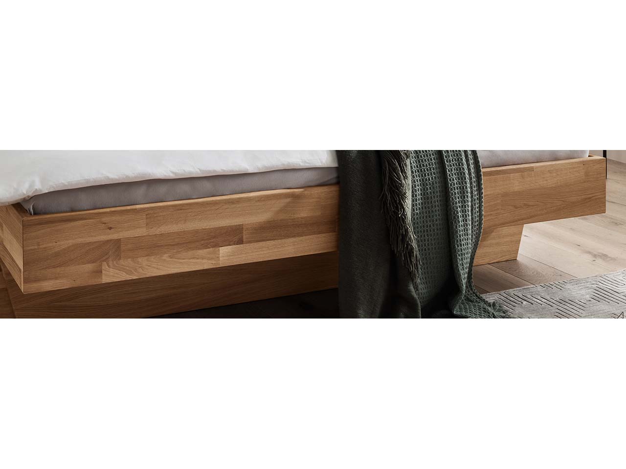 Viel Platz, um mal wieder so richtig auszuschlafen! Aus diesem Bett möchte man eigentlich gar nicht mehr aufstehen. Die klare Formensprache findet sich von Bettrahmen bis Kopfteil in jedem Bauteil wieder. Die Verarbeitung mit Parkettverleimung ist hochwertig, sodass das Bett zu einem jahrelangen Begleiter wird. Das ist auch kein Wunder, denn die Schwebeoptik, die durch de Holzunterbau entsteht, ist zeitlos schön. Das gilt auch für das massive Eichenholz mit seiner lebendigen, wilden Maserung. Im Unterbau sind zwei Schubladen integriert, die Platz für z.B. Laken, Bettwäsche oder Kissen bieten. Ein Platzwunder, das man dank Kopfteil auch im Sitzen genießen kann! In verschiedenen Größen erhältlich.