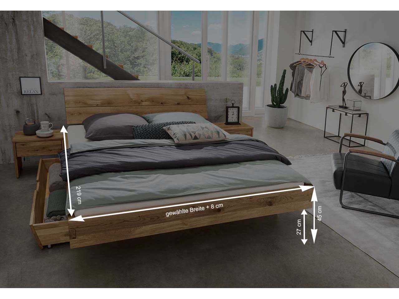 Ein Bett, wie es schöner kaum sein könnte! Der Holzbau unter dem Gestell lässt das Bett regelrecht schweben. Dabei sorgt das massive Eichenholz mit seiner intensiven Maserung, die wild und lebendig wirkt, für ein traumhaftes Design. Dieses zeigt sich auch an jeder Ecke und Kante des Bettes: Die Eckkanten sind per Fingerzinken verbunden! Das Zinken gilt in der klassischen Schreinerkunst als Königsdisziplin. Die Hochwertigkeit des Gestells ist auch im Kopfteil sichtbar. Dieses ist perfekt an die Optik angepasst und verströmt viel Natürlichkeit sowie Harmonie. Das Beste: Der Holzunterbau ist mit einem Bettkasten versehen, in dem sich Laken, Bettwäsche und mehr ordentlich verstauen lassen. In verschiedenen Größen erhältlich.