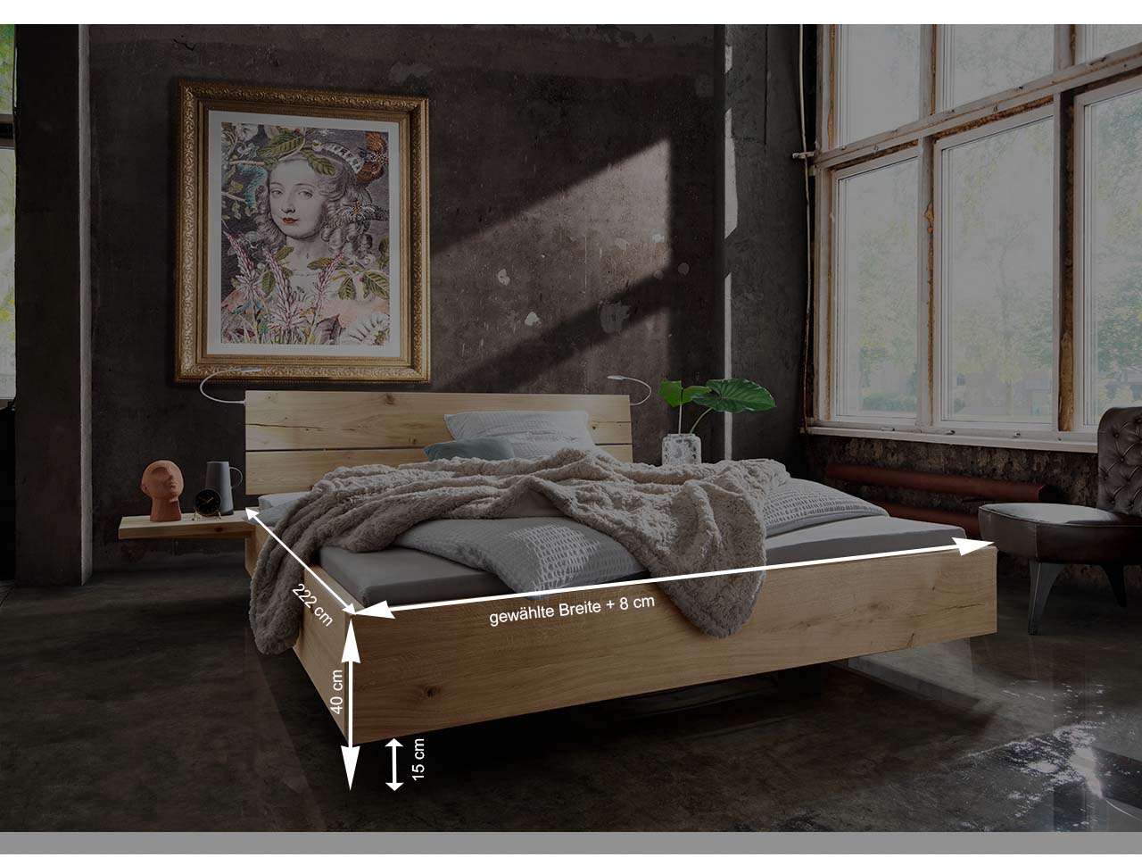 Ein vielseitiges Bett, das viele Jahre lang Freude bereitet! Die freundliche, natürliche Atmosphäre entsteht durch die Fertigung aus massivem Eichenholz aus nachhaltiger Forstwirtschaft. Da auch das Kopfteil aus Holz gefertigt ist, entsteht ein einheitliches Bild. Die Oberfläche ist zudem mit Öl auf Pflanzenbasis behandelt, sodass das Holz offenporig bleibt. Die hochwertige Verarbeitung des natürlichen Materials zeigt sich in jedem Detail, wie in den Eckverbindungen, die sorgfältig gearbeitet sind. Der Bettrahmen kommt gleich mit praktischer Hängekonsole! Darauf lassen sich z.B. die Abendlektüre, die Brille oder Ähnliches ablegen. Optisches Highlight ist die stabile Metallkufe, die für eine einmalige Schwebeoptik sorgt. Noch mehr Komfort beim Aufstehen und Hinlegen: Das Bettgestell ist wahlweise mit 40 oder 45 cm Höhe erhältlich. So kann man das für sich perfekt passende Bett auswählen.