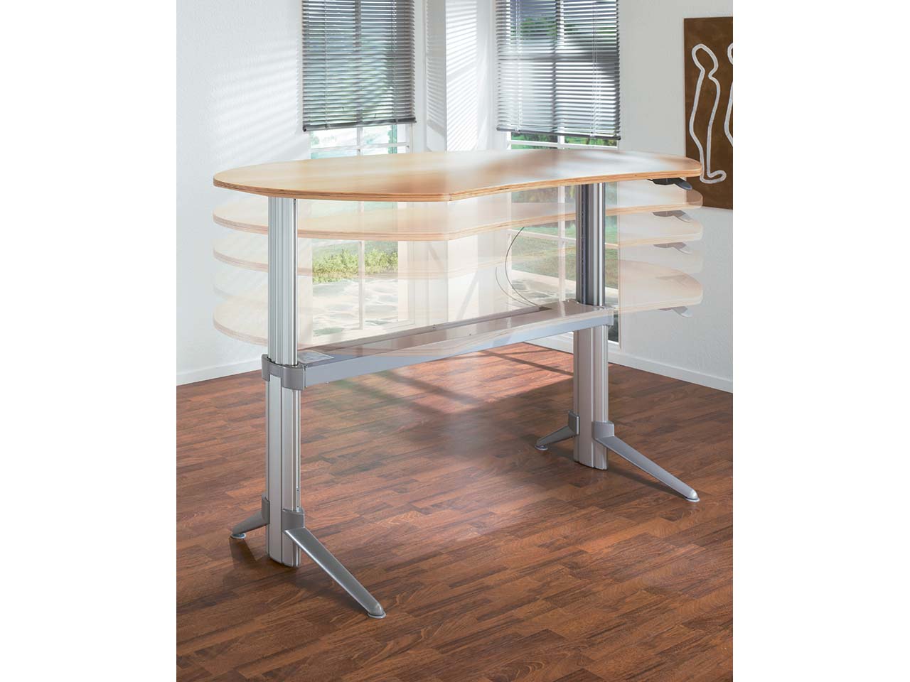Die Leuwico symmetrischen Freiformtische "Go²move" bieten sich zum ergonomischen Arbeiten an. Mit einer robusten Arbeitsplatte aus Birken- und Buchenschichtholz und einem stabilen Gestell aus Metall. In der Höhe manuell verstellbar. Mit abgerundeten Formen und Kabelkanal. B 200 x T 108 x H 68-130 cm.