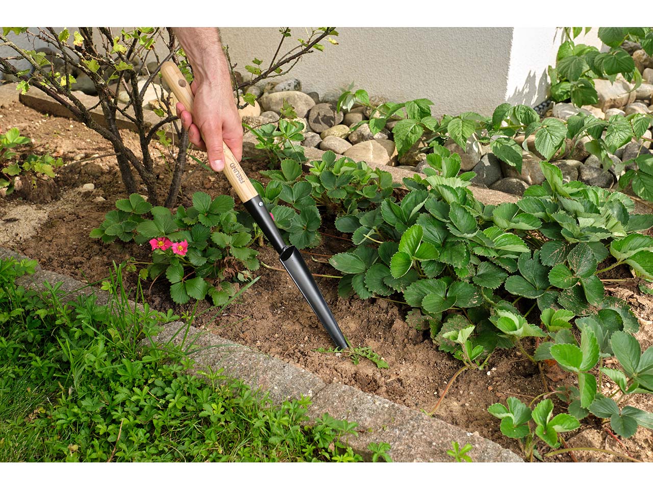 Der Unkrautstecher ist mit einem pulverbeschichteten, schwarzen Stahlkopf ausgestattet, der robust und korrosionsbeständig ist. Der FSC-zertifizierte Eschenholz-Kurzstiel sorgt für eine komfortable Handhabung und präzises Arbeiten. Das Gartenwerkzeug ist perfekt, um Unkraut mitsamt Wurzeln mühelos zu entfernen, ohne die umliegenden Pflanzen zu beschädigen. Die integrierte Aufhängebohrung ermöglicht eine platzsparende Aufbewahrung. B 4 x L 52 x H 2,6 cm.