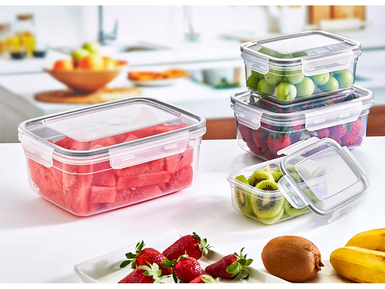 Perfekt, um Obst, Gemüse, Käse, Aufschnitt und mehr frisch zu halten! Diese langlebige Frischhaltedose aus lebensmittelechtem PP-Kunststoff punktet mit ihrer robusten Verarbeitung und vielseitigen Einsatzmöglichkeiten. Der 4-fach-Klick-Verschluss gewährleistet eine luft- und wasserdichte Aufbewahrung, die Lebensmittel sicher schützt. Mit einem großzügigen Fassungsvermögen von 1,4 l ist die rechteckige Dose ideal für den Kühlschrank, das Gefrierfach oder den unkomplizierten Transport von Speisen.