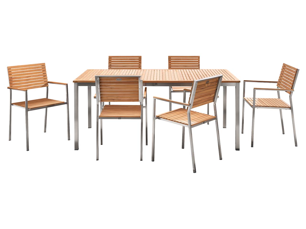 Gibt es etwas Schöneres, als im Garten zu sitzen und zu entspannen? Um diese Momente der Auszeit so richtig zu genießen, ist dieses 7-teilige Gartenmöbelset mit Tisch und Sitzgelegenheiten perfekt. Die parallel angelegten Streben aus FSC-zertifiziertem Teakholz aus verantwortungsvoller Forstwirtschaft harmonieren wunderbar mit dem gebürsteten Edelstahl, der die schlichte Natürlichkeit aufbricht und sie modern und zeitlos wirken lässt. Der große Tisch bietet viel Platz für Feste und Feiern oder einfach, um mit den liebsten Menschen zusammenzusitzen und gut zu essen. Dafür sind 6 Gartensessel in dem Set enthalten, auf denen es sich bequem sitzen lässt. Das Beste: Die Gartenmöbelgruppe kann das gesamte Jahr über draußen stehen! Das Teakholz hat nämlich eine besonders witterungsbeständige, robuste Qualität. Das Set bereitet so viele Sommer lang Freude.