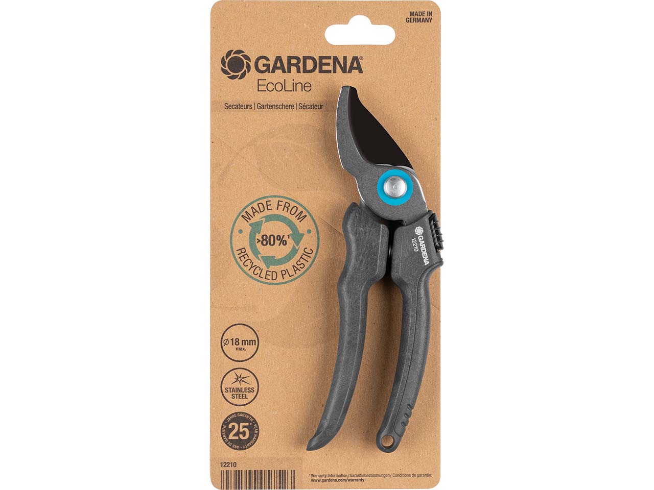 Mit dieser Gartenschere ist es ein Leichtes, Blumen und junge Pflanzentriebe präzise zu schneiden! Sie liegt dank ergonomischem Griff sehr gut in der Hand. Die präzisionsgeschliffenen Edelstahlklingen am Schneidkopf arbeiten kraftvoll und erleichtern so die Gartenarbeit. Die Gartenschere verfügt über praktische Extras wie Saftrille und Drahtschneidefunktion. Mit dem Einhand-Sicherheitsverschluss ist es ganz einfach, die Schere zu verriegeln und aufzubewahren. Als Teil der EcoLine bestehen die Kunststoffkomponenten des in Deutschland hergestellten Gartengeräts zu über 80 % aus Recyclingmaterial. Auch die verarbeiteten Stahlelemente sind zu 75 % aus recyceltem Material.