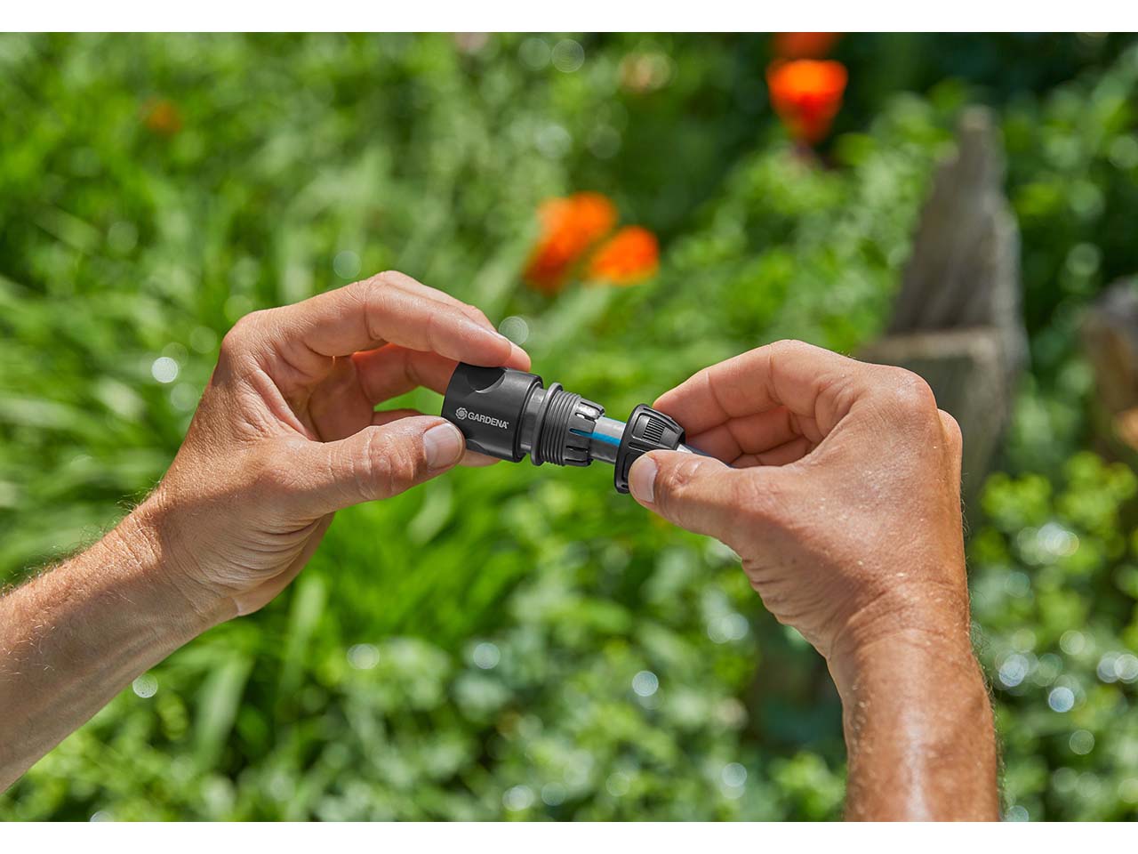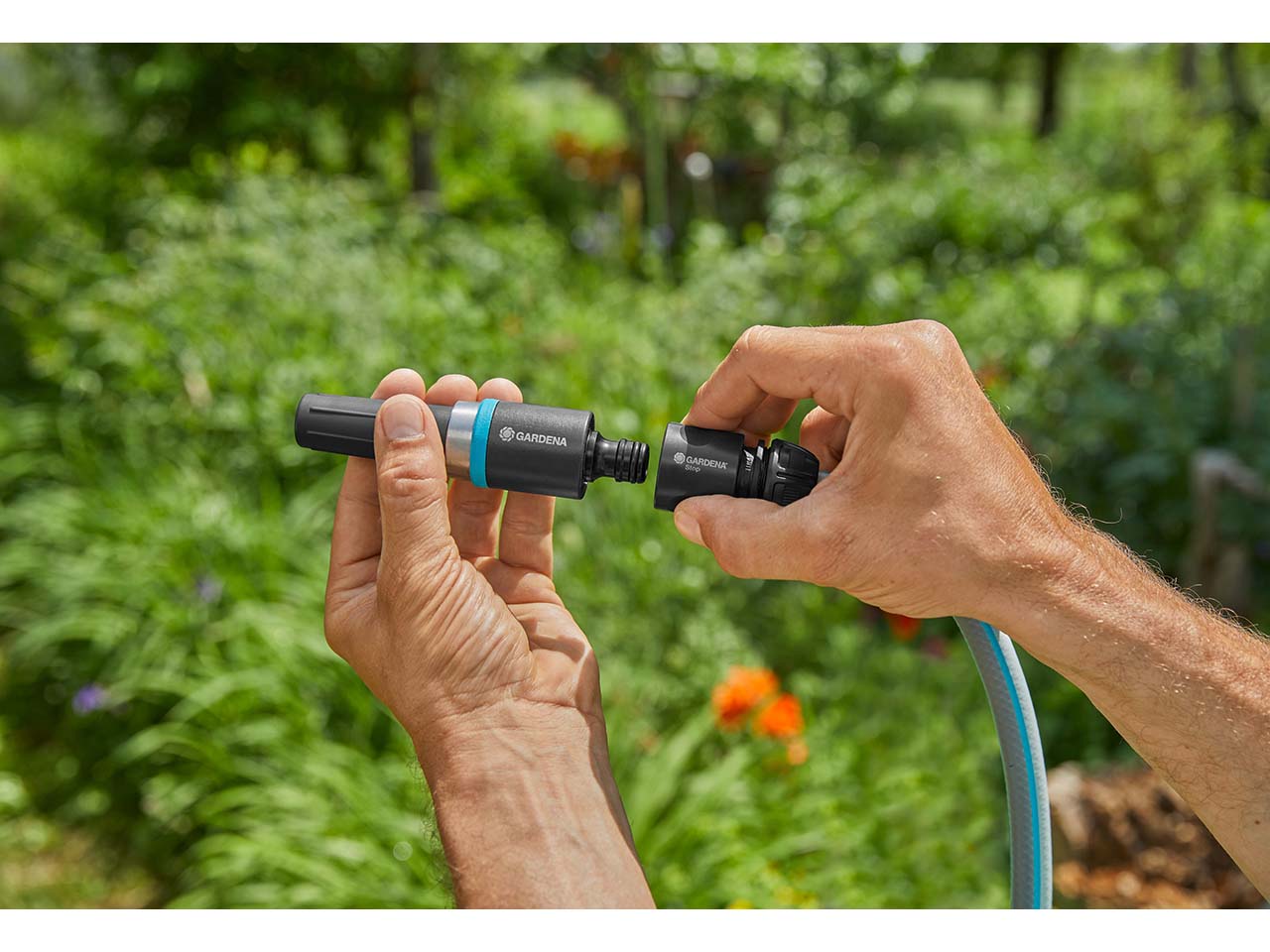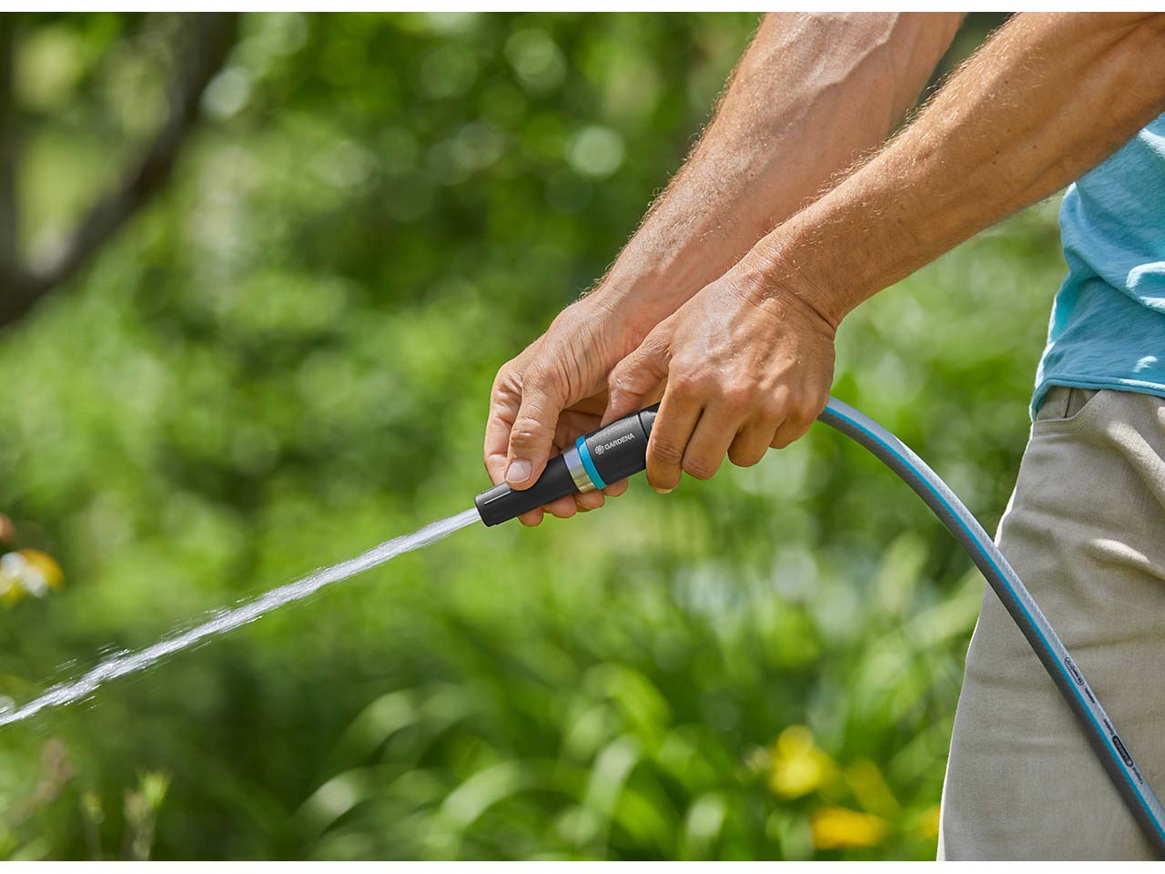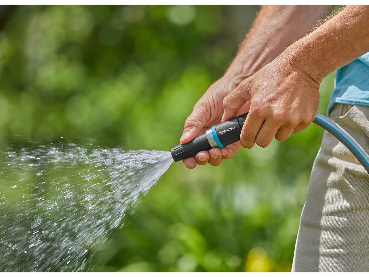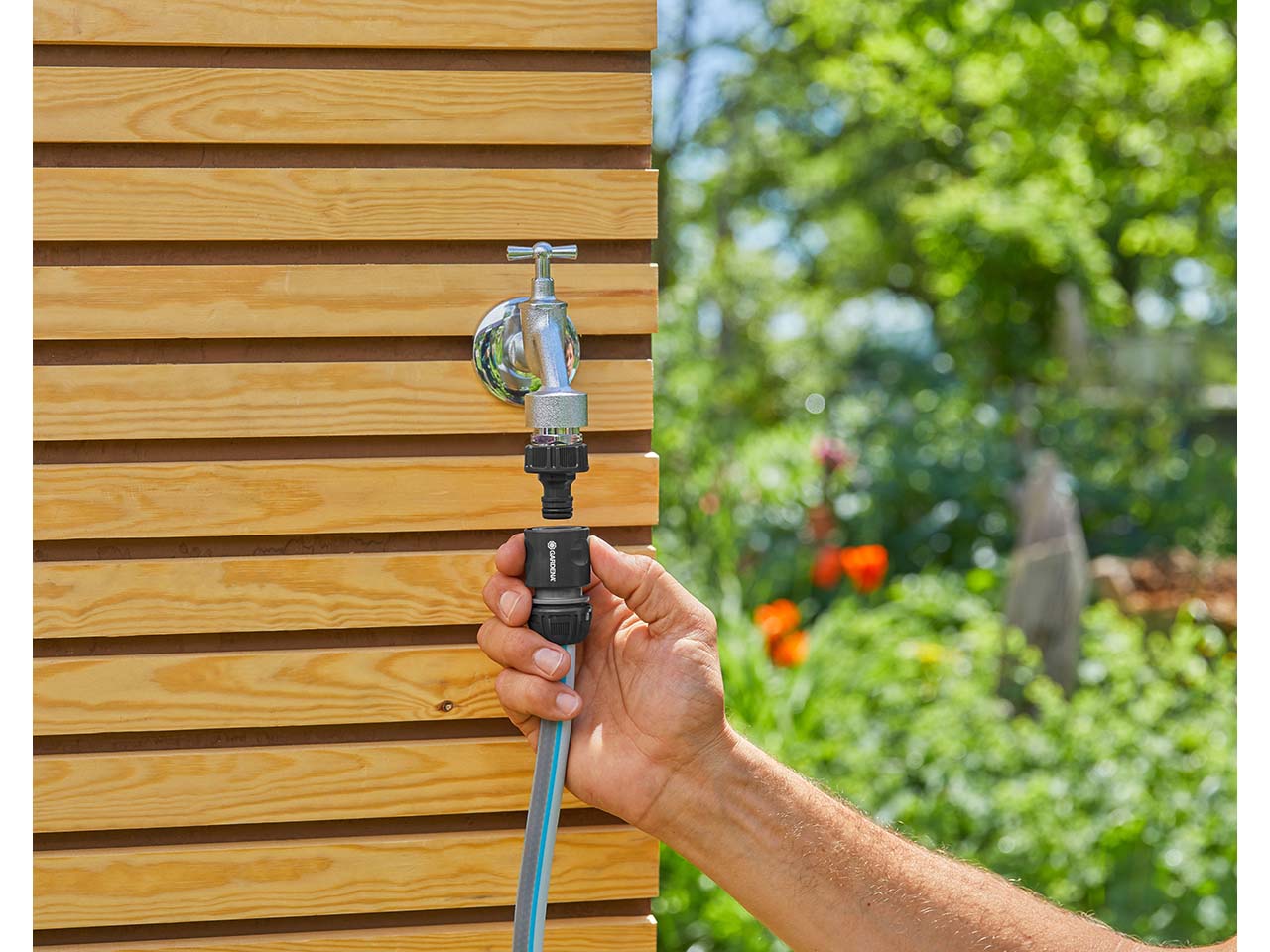 Die Grundausstattung ist unverzichtbar für den Garten! Das Komplettset zum Bewässern und Reinigen enthält Reinigungsspritze, Wasserstop, Hahnverbinder, Schlauchverbinder sowie Adapter für Wasserhähne mit einem Gewinde von 33,3 mm (G 1“) und 26,5 mm (G 3/4") sowie für Schläuche mit 13 mm (1/2") und 15 mm (5/8"). Dank der hochwertigen Verarbeitung kann das Set über einen langen Zeitraum benutzt werden. Die Kunststoffkomponenten bestehen zu über 90 % aus Recyclingmaterial. Selbst die Metallelemente enthalten zu 35 % recyceltes Material. Highlights der Grundausstattung sind der 2-in-1-Sprühstrahl der Reinigungsspritze, der immer für einen optimalen Wasserstrahl sorgt und stufenlos einstellbar ist. Der Hahnverbinder verfügt über eine Anti-Splash-Funktion. Da das Set UV- und frostbeständig ist, kann es das ganze Jahr draußen im Garten bleiben.