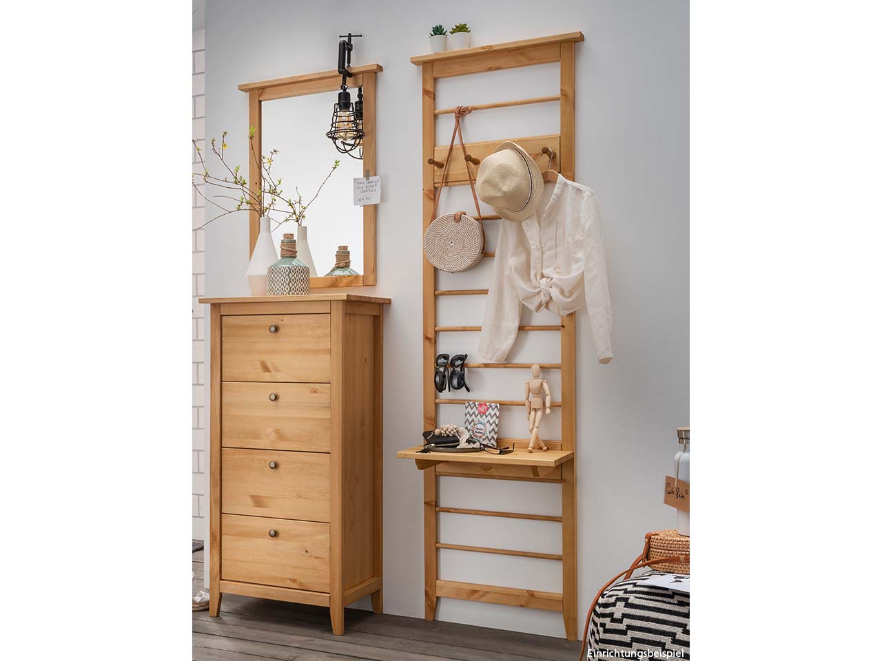 Eine ganz individuelle Garderobe: Das Ablageelement wird am gleichnamigen Rippenelement angebracht und dient dazu, Dinge darauf abzustellen. Das können Bücher, Dekoration oder Schuhe sein! Das macht das Ablageelement besonders vielseitig. Gefertigt ist es wie die weiteren Elemente aus der Serie „Solvita“ aus FSC-zertifiziertem Kiefernholz. B 52 x T 28,6 x H 10,1 cm.