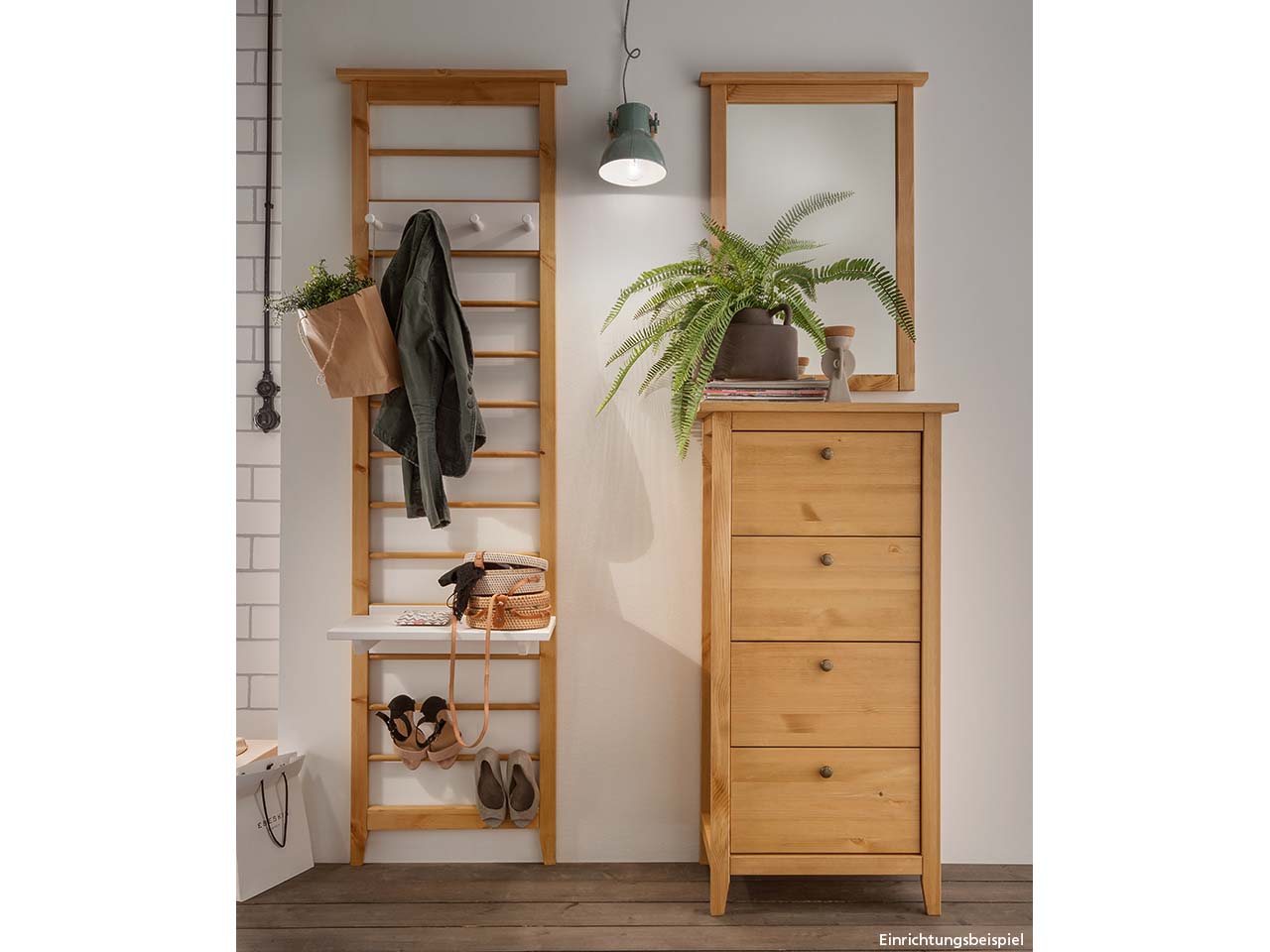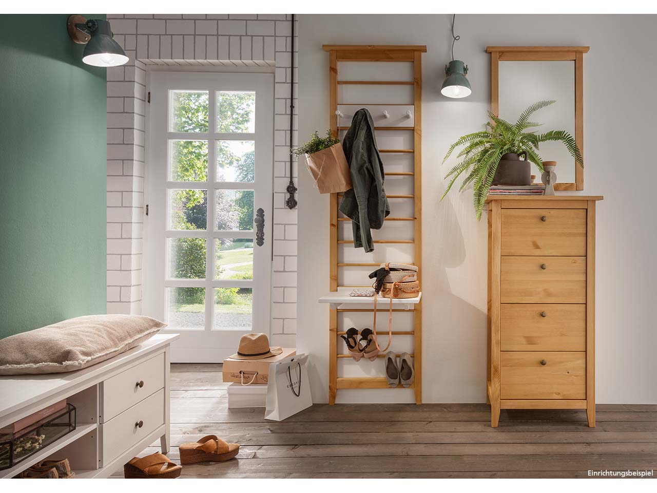 Eine ganz individuelle Garderobe: Das Ablageelement wird am gleichnamigen Rippenelement angebracht und dient dazu, Dinge darauf abzustellen. Das können Bücher, Dekoration oder Schuhe sein! Das macht das Ablageelement besonders vielseitig. Gefertigt ist es wie die weiteren Elemente aus der Serie „Solvita“ aus FSC-zertifiziertem Kiefernholz. B 52 x T 28,6 x H 10,1 cm.