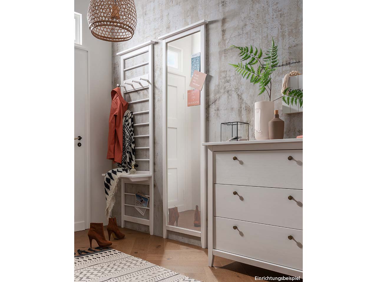 Die Hakenleiste ist ideal, um das gleichnamige Rippenelement zu individualisieren und noch praktischer zu machen. Die vier Haken eignen sich, um Kleidung wie Jacken daran zu hängen. Wie die weiteren Elemente aus der Serie „Solvita“ ist auch die Hakenleiste aus FSC-zertifiziertem Kiefernholz gefertigt. Es ist weiß lackiert oder mit Lauge behandelt erhältlich. So ist eine einheitliche Optik oder ein Vermischen der Designs möglich. B 43,6 x T 8 x H 10,1 cm.