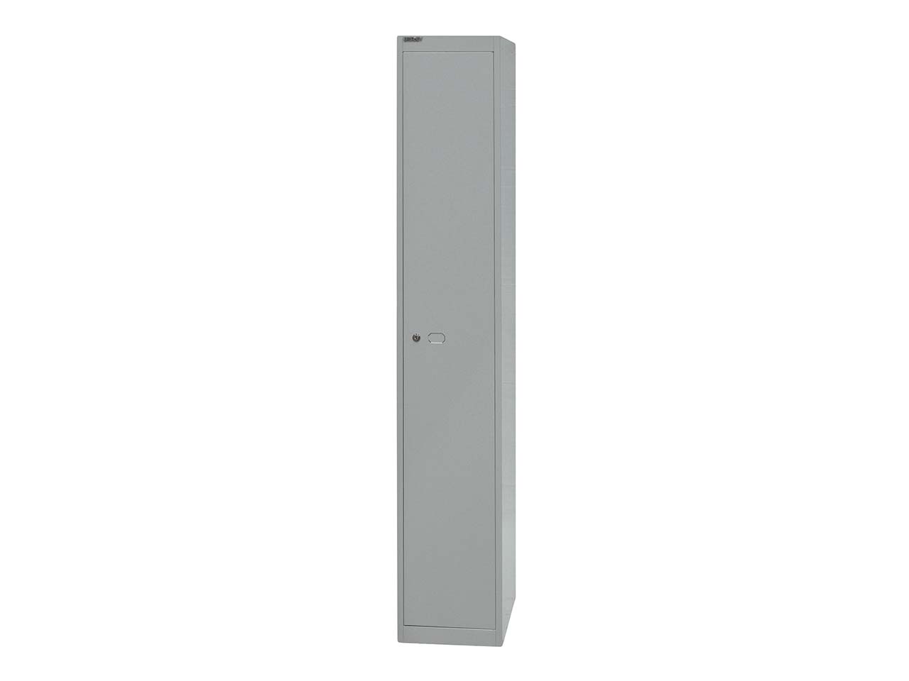 Der BISLEY Garderobenschrank "Light" aus langlebigem Stahl verfügt über Belüftungslöcher an der Ober- und Unterseite, Zylinderschloss und Etikettenhalter. Der Spind ist mit einem Fachboden und einem Kleiderhaken ausgestattet. B 30,5 x T 45,7 x H 180,2 cm. Farbe silber.