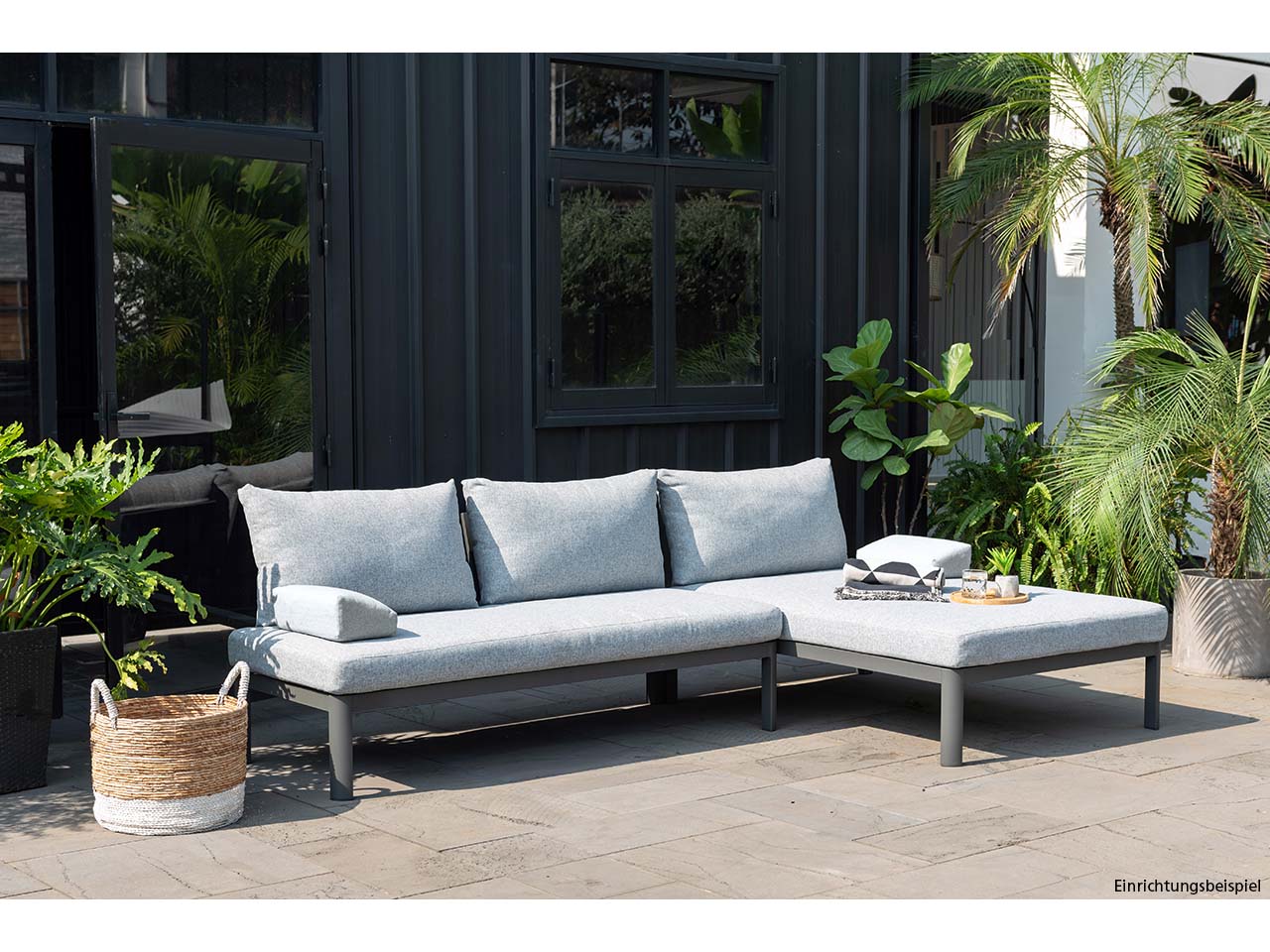 Flexibel bleiben – auch im Garten und auf der Terrasse! Genau das ermöglicht das Ecksofa für den Außenbereich. Es besteht aus einem 2-Sitzer und einem XL-Daybed. Zusammengestellt ergibt sich daraus ein Ecksofa. Doch die Gartenmöbel lassen sich auch separat aufstellen – eben genau so, wie es gerade benötigt wird. Auf den Lounge-Möbeln ist viel Platz, um es sich gemütlich zu machen. Dabei ist immer höchster Sitzkomfort garantiert, denn das Ecksofa verfügt über Sitz- und Rückenkissen. Diese haben wetterfeste Bezüge aus recyceltem Polyester. Das hat auch gleich noch den Vorteil, dass das Ecksofa umweltverträglicher ist als viele andere Gartenmöbel! Das Gestell besteht aus pulverbeschichtetem Aluminium, das für hochwertige, langlebige Qualität sorgt. B 275 x T 146/80 x H 74 cm.