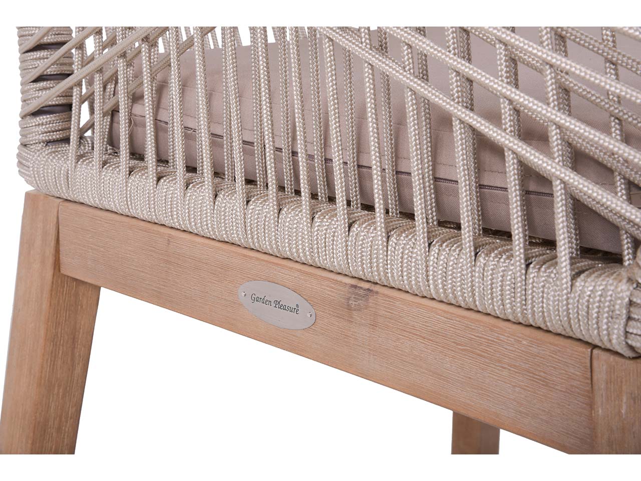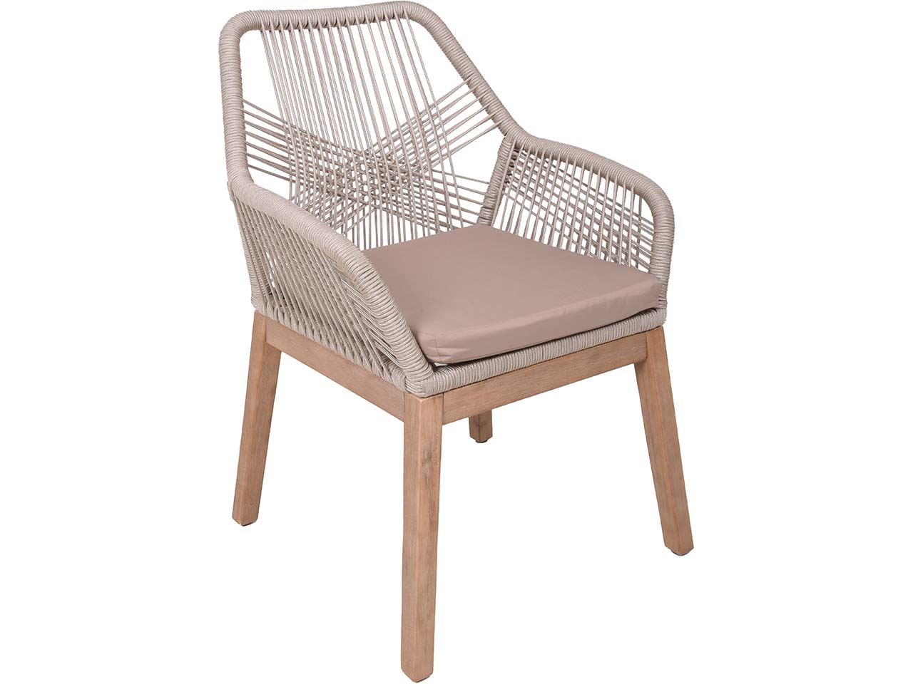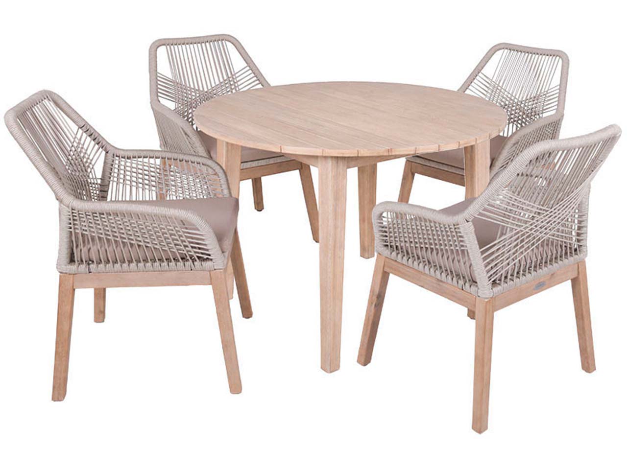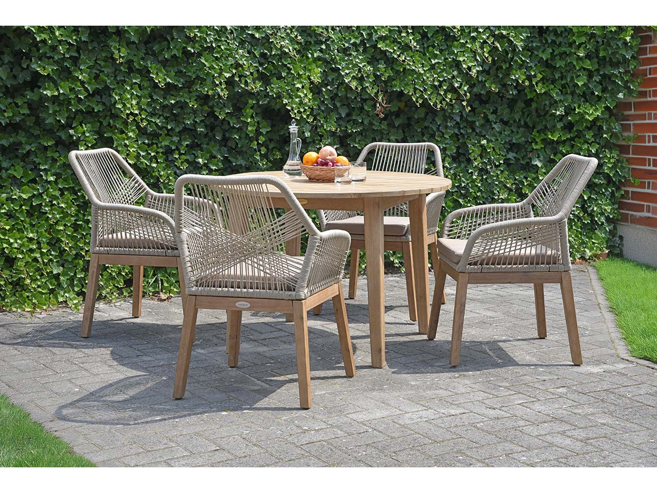 Hier treffen moderne und natürliche Elemente aufeinander! Das Gartenmöbel-Set für Garten, Terrasse oder großen Balkon überzeugt mit zeitlosem Design, das lange Freude bereitet. Die beige Seilbespannung an den vier Sesseln harmoniert wunderbar mit dem Holz der Stuhlbeine und des Tisches. Es wird FSC-zertifiziertes Akazienholz verwendet. Die Gartenmöbel sind perfekt für gemütliches Zusammensitzen, für Partys oder für Grillabende.