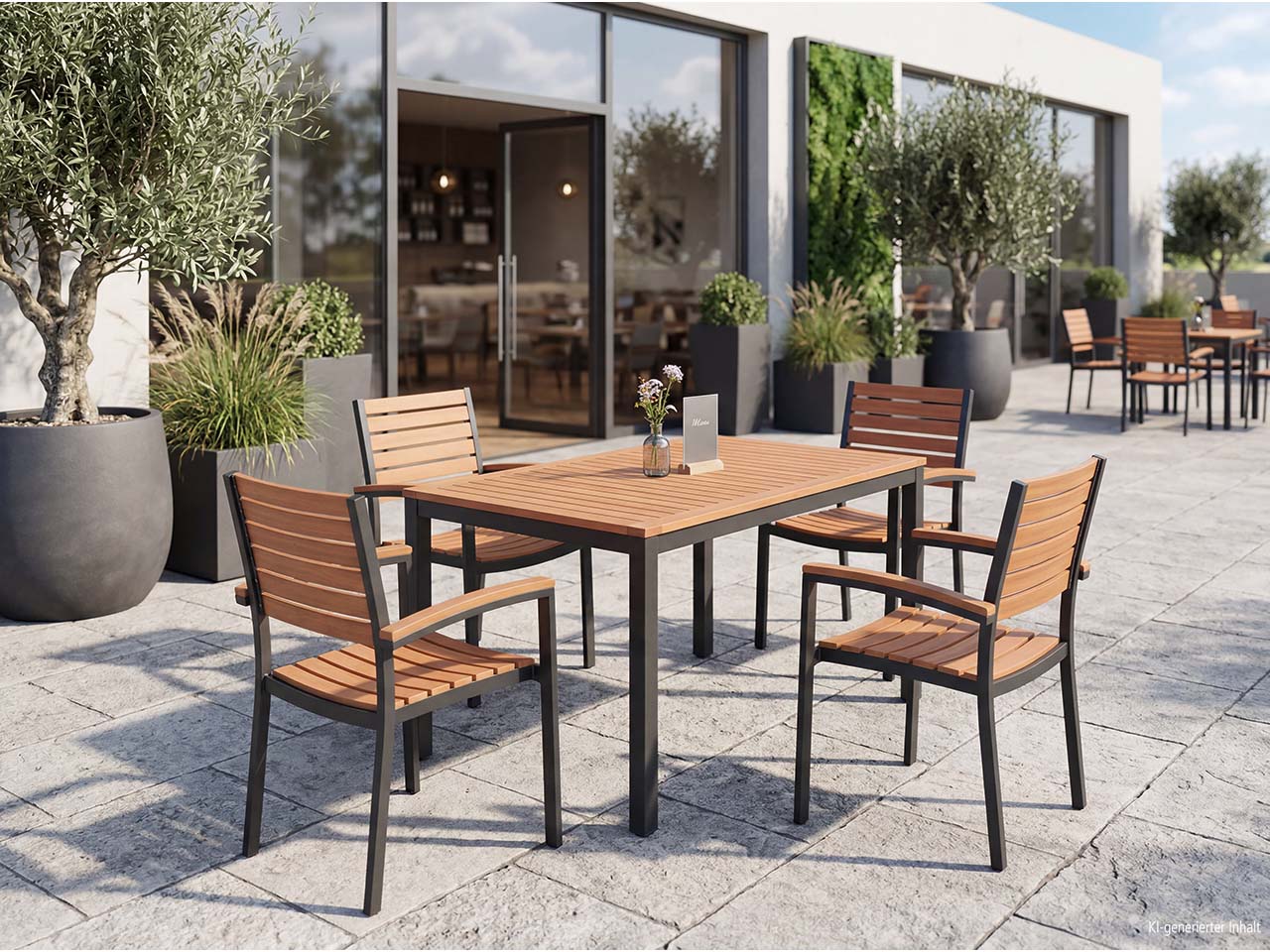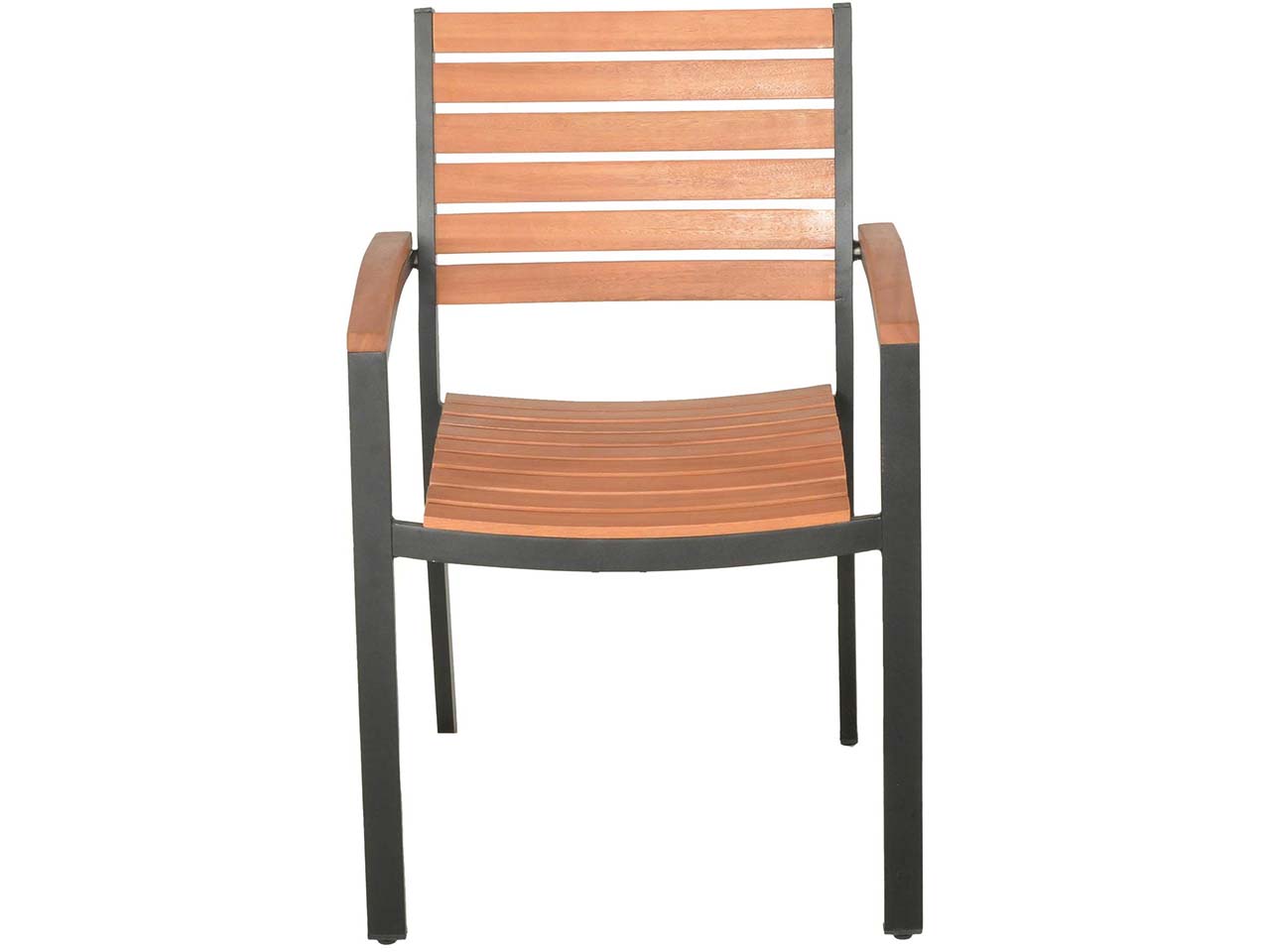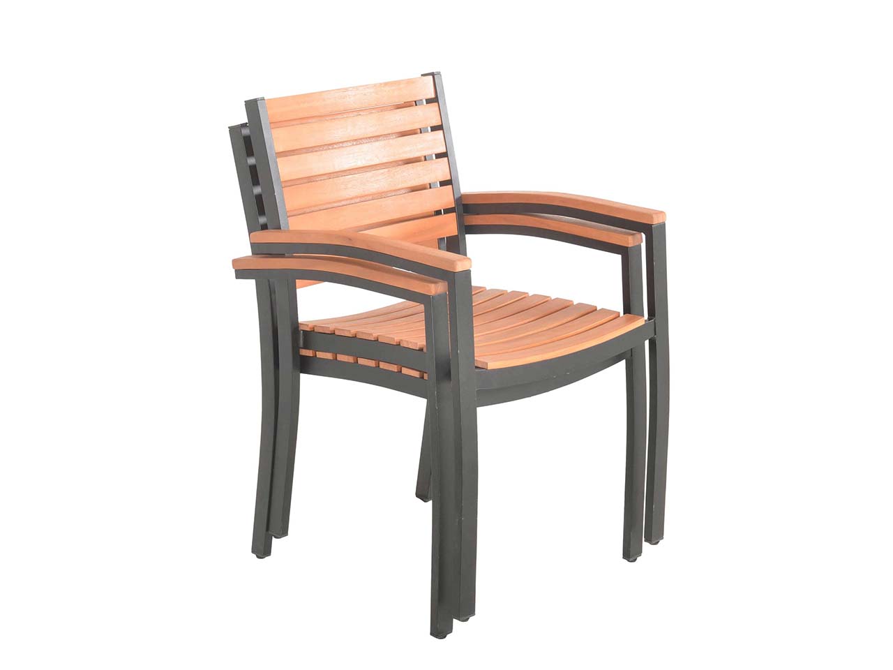 Natürliche Optik und robuster, moderner Stil vereinen sich hier zu einem wunderschönen Gartenmöbel-Set für Terrasse, Garten oder andere Außenbereiche. Der große Tisch und die passenden, stapelbaren Gartensessel bestehen aus FSC-zertifiziertem Eukalyptusholz und Aluminium. Dadurch entsteht ein spannender Kontrast, an dem man lange Freude hat.