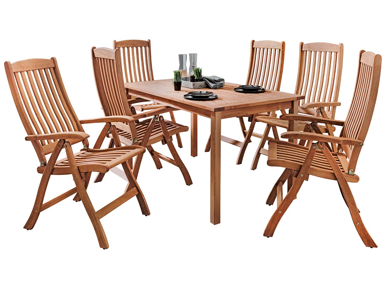 Wer gerne Zeit im Garten mit Familie und Freunden verbringt, sollte sich für dieses 7-teilige Gartenmöbel-Set aus FSC-zertifiziertem Robinienholz entscheiden. Es besteht aus einem rechteckigen Tisch und 6 klappbaren Gartensesseln, die durch die verstellbare Rückenlehne besonderen Komfort bieten. Neben dem minimalistischen und zeitlosen Design überzeugt das Set "Calea" auch mit seiner hochwertigen Verarbeitung aus robustem Robinienholz, die es besonders stabil und langlebig macht. Die spezielle Holzlasur macht Tisch und Stühle zudem wetterfest – so bieten sie zu jeder Jahreszeit die perfekte Sitzmöglichkeit für die gemeinsame Grillfeier, das Gartenfest oder einen gemütlichen Sommerabend auf der Terrasse oder auf einem großen Balkon. Herstellung in Europa. Tisch: B 150 x T 90 x H 75 cm.