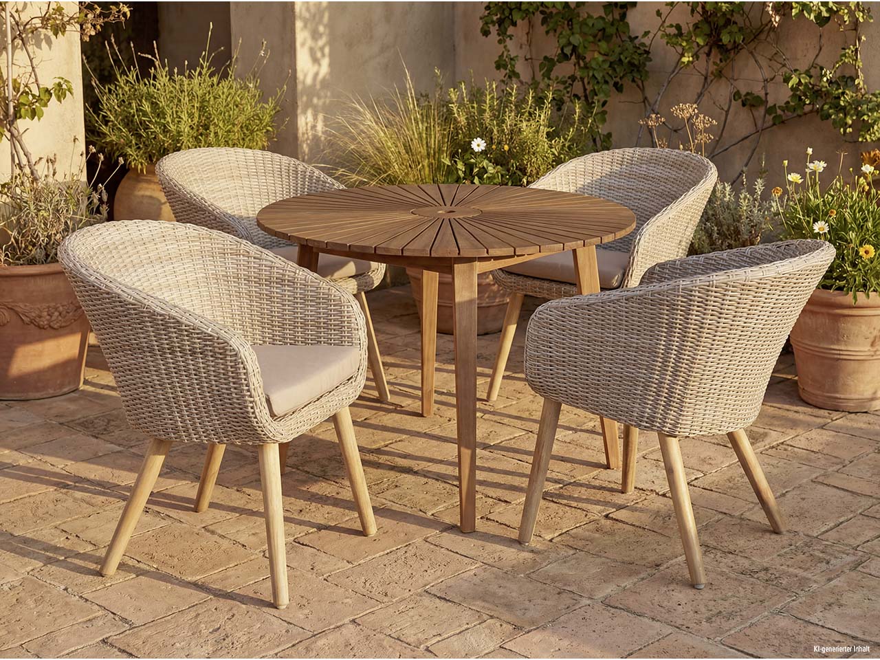 An diesem stilvollen Set nimmt man im Garten oder auf der Terrasse gerne Platz! Highlight ist der kunstvolle, runde Tisch aus FSC-zertifiziertem Akazienholz. Auf ihm lassen sich Getränke, Snacks und ganze Mahlzeiten in gemütlicher Runde teilen. Die vier Stühle überzeugen mit hohem Sitzkomfort. Zu diesem tragen das Kunststoffgeflecht und die Auflagen bei. Die Gartenmöbel sind ausgesprochen robust und langlebig – perfekt, um lange Freude daran zu haben.