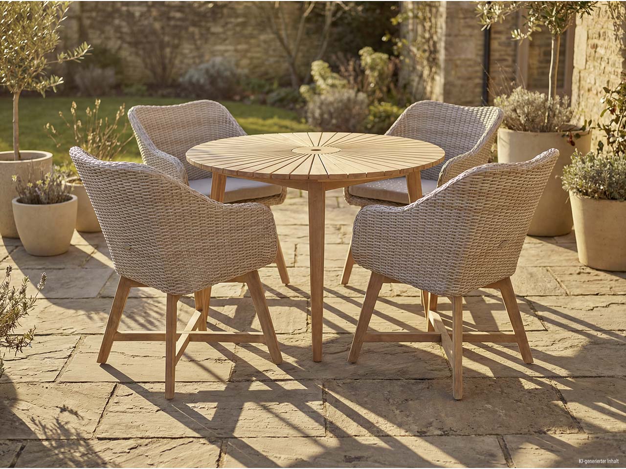 Für gemütliche Stunden im Freien: Das Gartenmöbel-Set mit rundem Tisch und vier Gartensesseln ist perfekt für alle, die gerne auf dem Balkon, auf der Terrasse oder im Garten sitzen. Die Holzelemente bestehen aus FSC-zertifiziertem Akazienholz. Die Stühle haben eine Sitzschale aus hochwertigem, pflegeleichtem Kunststoffgeflecht. Für noch mehr Sitzkomfort sorgen die Auflagen. Der Gartentisch ist so konzipiert, dass sich bei Sonne ein Sonnenschirm aufspannen lässt.