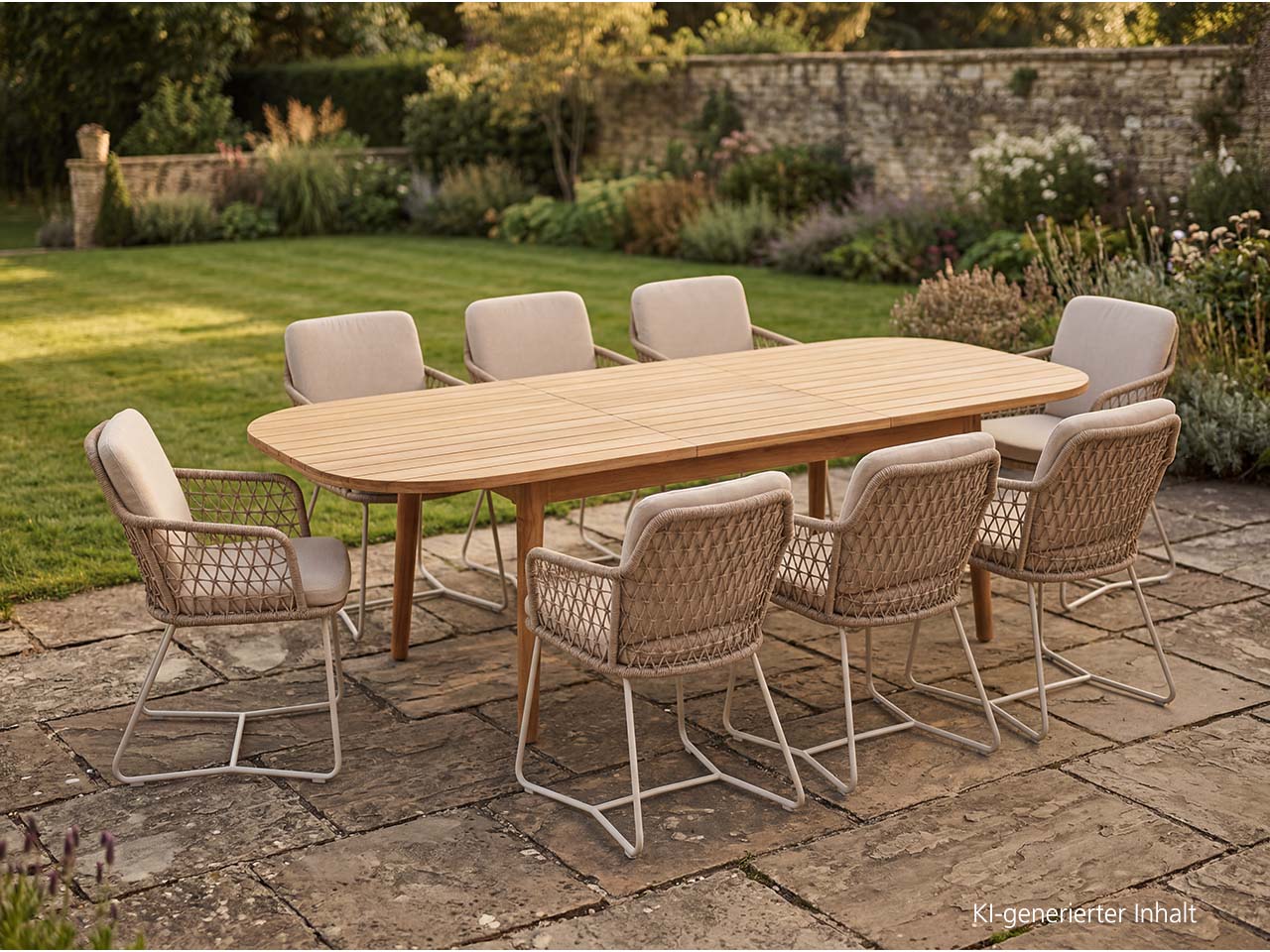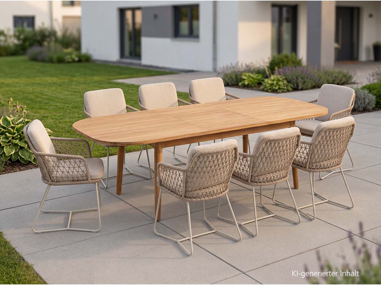 Jetzt kann die ganze Familie eingeladen werden! An diesem Gartentisch finden alle Platz – er lässt sich nämlich ausziehen. Dank fein gemasertem, robustem Akazienholz überzeugt der Tisch mit einer wetterfesten, natürlichen Qualität. Die acht Gartensessel passen mit ihrem filigranen Gestell perfekt zu dem Tisch mit abgerundeten Formen. Ein weiches Sitz- und Rückenkissen sorgt für hohen Sitzkomfort beim Draußensitzen.