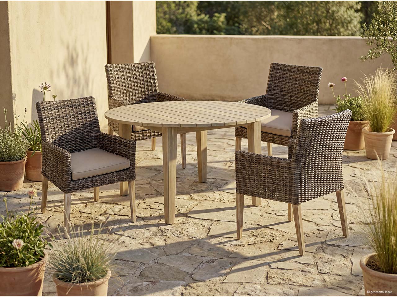 Ehrlicher Minimalismus für Garten, Balkon oder Terrasse! Dieses Gartenmöbel-Set lässt keine Wünsche offen. Vier Gartenstühle aus FSC-zertifiziertem Akazienholz und Kunststoffgeflecht sowie ein großer, runder Holztisch laden zum Verweilen und Genießen ein. Die Stühle haben eine weiche Auflage, die den Sitzkomfort noch erhöht.