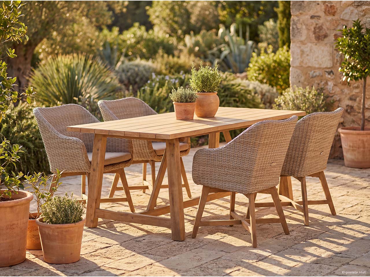 Natürliche Schönheit und perfekt aufeinander abgestimmte Komponenten zeichnen dieses Gartenmöbel-Set aus. Tisch und Stuhlbeine bestehen zu 100 % aus FSC-zertifiziertem Akazienholz. Die Stühle haben ein strapazierfähiges, pflegeleichtes Kunststoffgeflecht und sind mit einer weichen Sitzauflage versehen. Die Tischgruppe bietet viel Platz für gemütliches Zusammensitzen im Garten oder auf der Terrasse.
