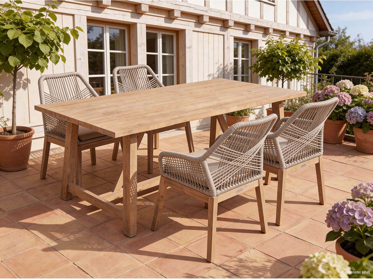 Hier treffen moderne Elemente auf Natürlichkeit: Das Gartenmöbel-Set besteht aus einem rechteckigen Tisch aus FSC-zertifiziertem Akazienholz und Hybrid-Stühlen aus Holz und Seilbespannung. Die Tischgruppe für Garten oder Terrasse zeichnet sich durch Stabilität und Langlebigkeit aus.