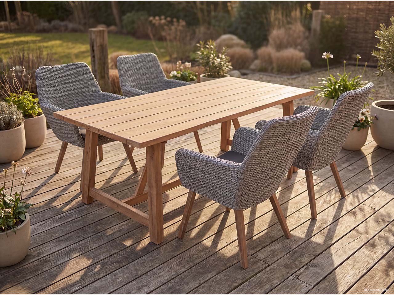 Dieses perfekt aufeinander abgestimmte Gartenmöbel-Set bereichert Garten oder Terrasse. Die Sessel aus Kunststoffgeflecht und FSC-zertifiziertem Akazienholz sorgen dank weicher Sitzauflagen für ganz viel Gemütlichkeit. An dem stabilen, rechteckigen Holztisch sitzt es sich besonders gut – und er bietet viel Platz, um bei gemeinsamen Grillabenden oder bei Feiern gemeinsam zu essen.