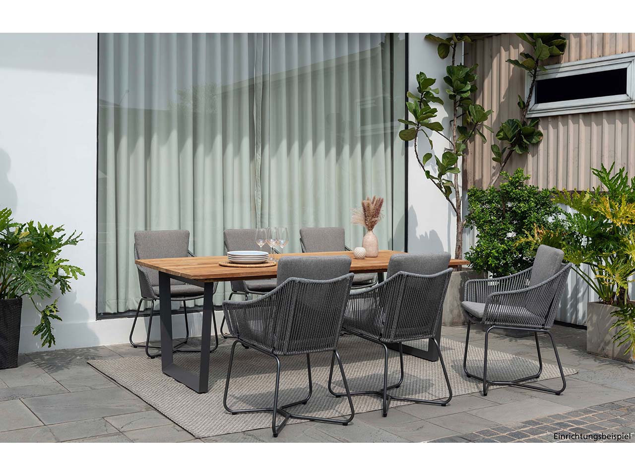 Mit diesem Gartenmöbel-Set ist es ein Kinderspiel, es sich im Garten oder auf der Terrasse gemütlich zu machen! Die sechs raffiniert designten Stühle bieten hohen Sitzkomfort. Sie haben ein Gestell aus verzinktem Stahl, das viel Stabilität verspricht. Gemütlich wird es durch die Seilbespannung und die Sitz- und Rückenkissen. Diese verfügen über abnehm- und waschbare Olefin-Bezüge. Das Material zeichnet sich durch UV-Beständigkeit, wetterfeste Qualität und angenehme Haptik aus. Der Gartentisch mit 216 x 99 cm ist optisch wie funktional ein Highlight. Die Kombination aus pulverbeschichtetem Aluminium und recyceltem, FSC-zertifiziertem Teakholz sorgt für eine natürliche Eleganz. Die Verwendung von Recyclingholz macht den Gartentisch besonders umweltgerecht. 1 Set = 1 Gartentisch, 6 Gartenstühle.